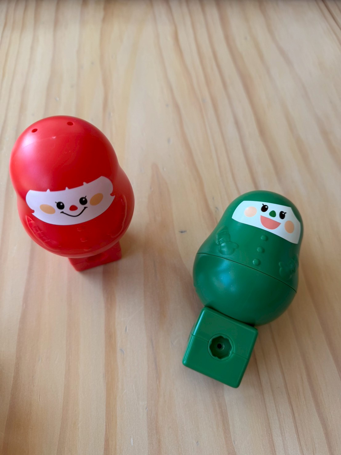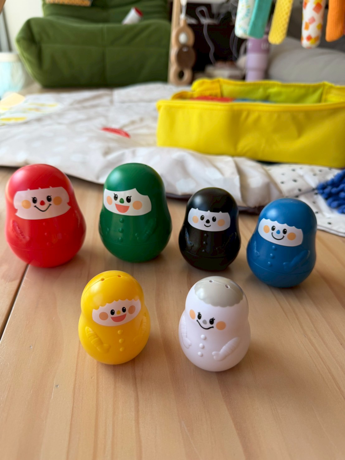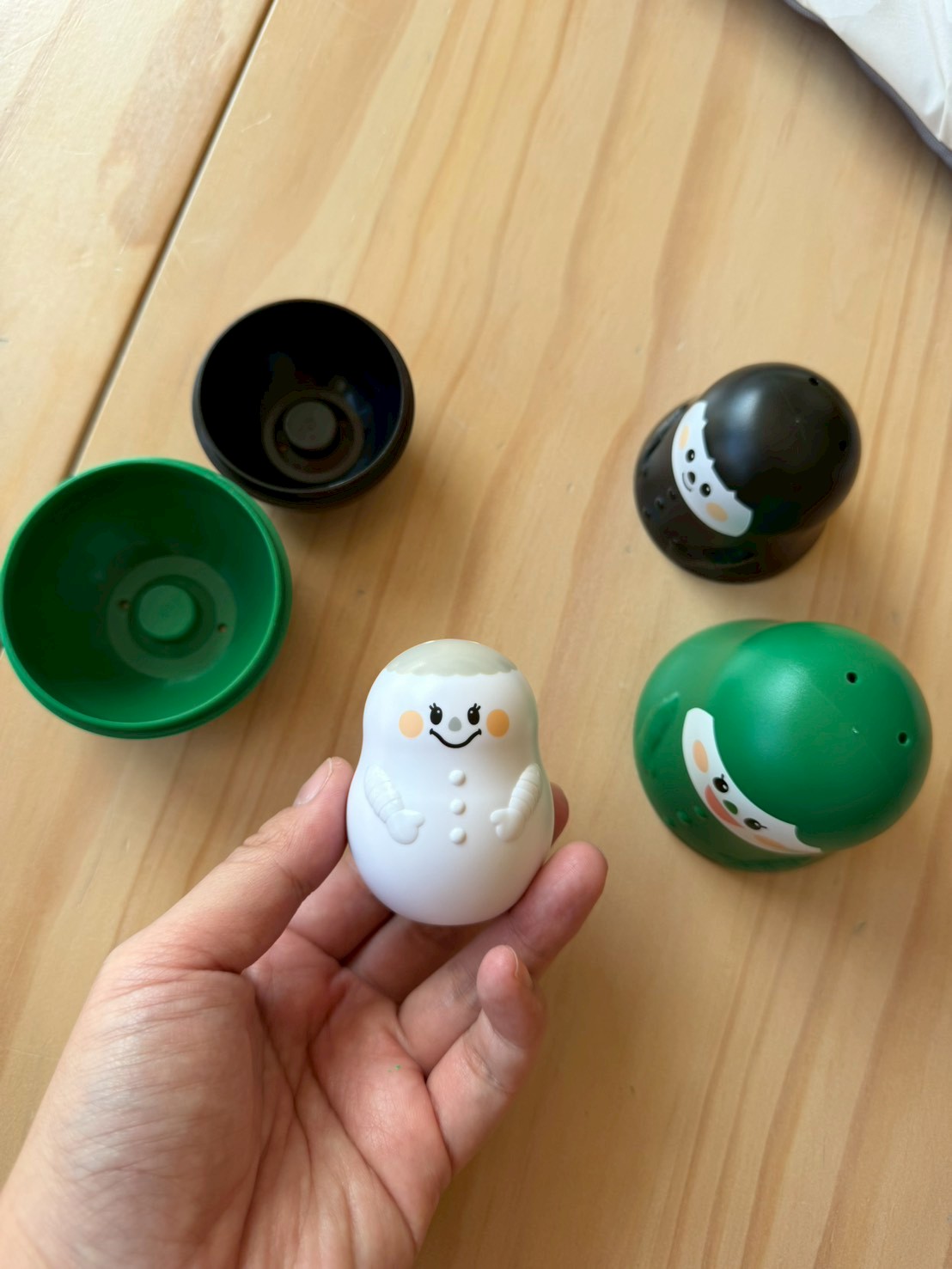 這組娃娃像俄羅斯娃娃一樣可以互相堆疊。 這對一歲多的孩子來說是很大的挑戰!