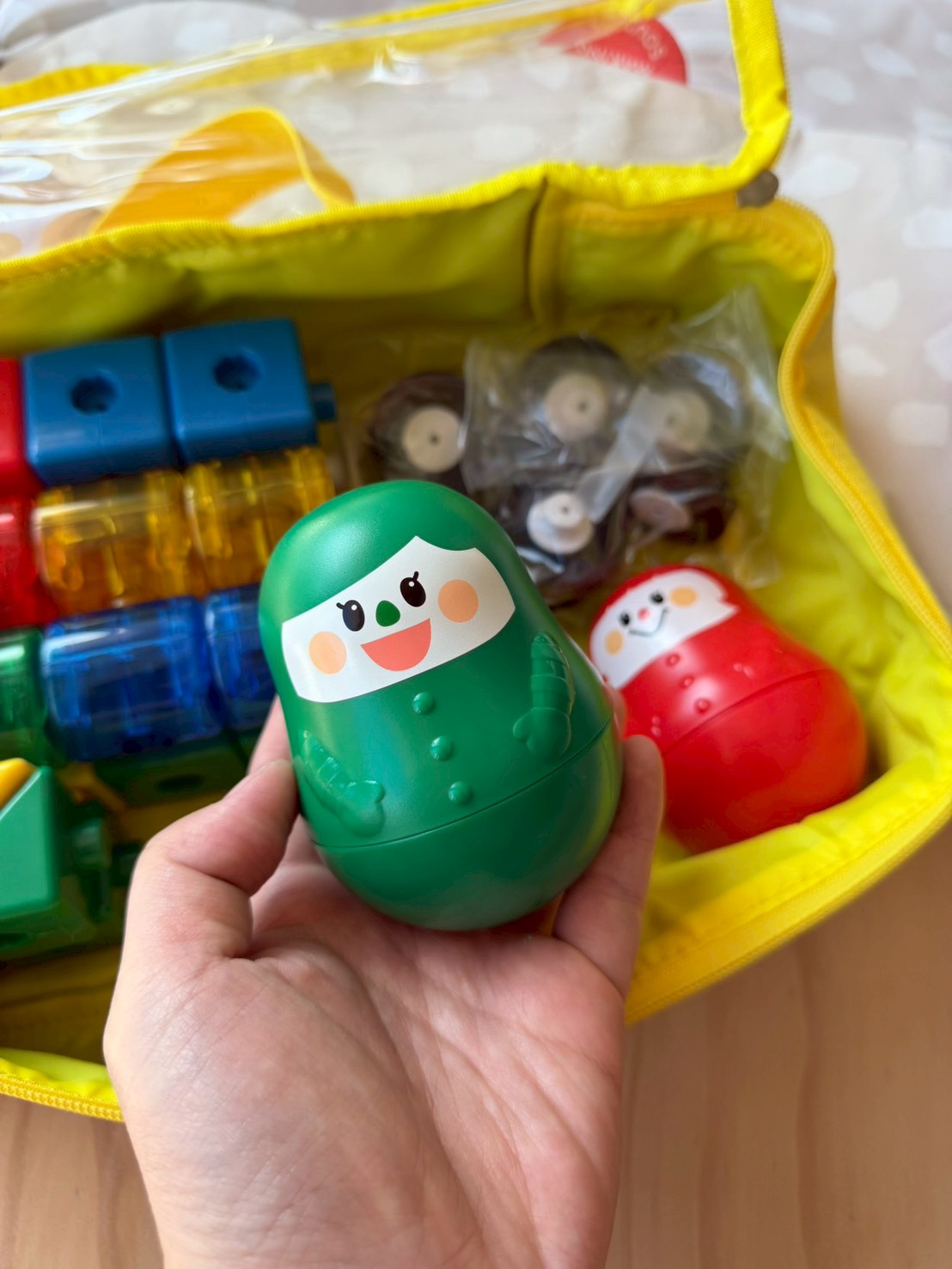 專屬的透明提袋,空間充裕,讓孩子練習把積木通通放回家。