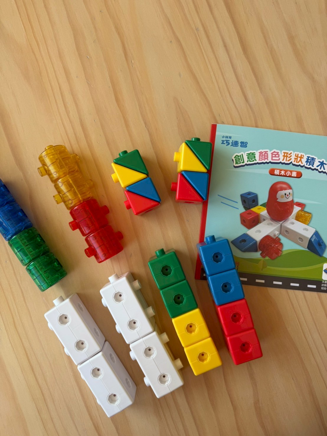 創意顏色形狀積木組: 最適合小小孩抓握的第一套積木,從動手操作搭建到顏色配對、玩嚕嚕車通通都沒問題!
