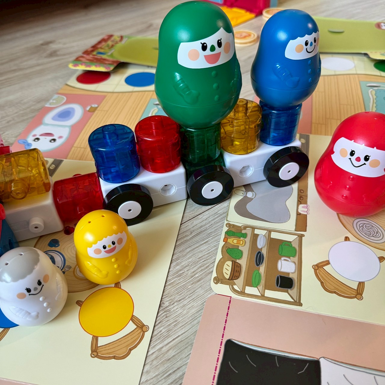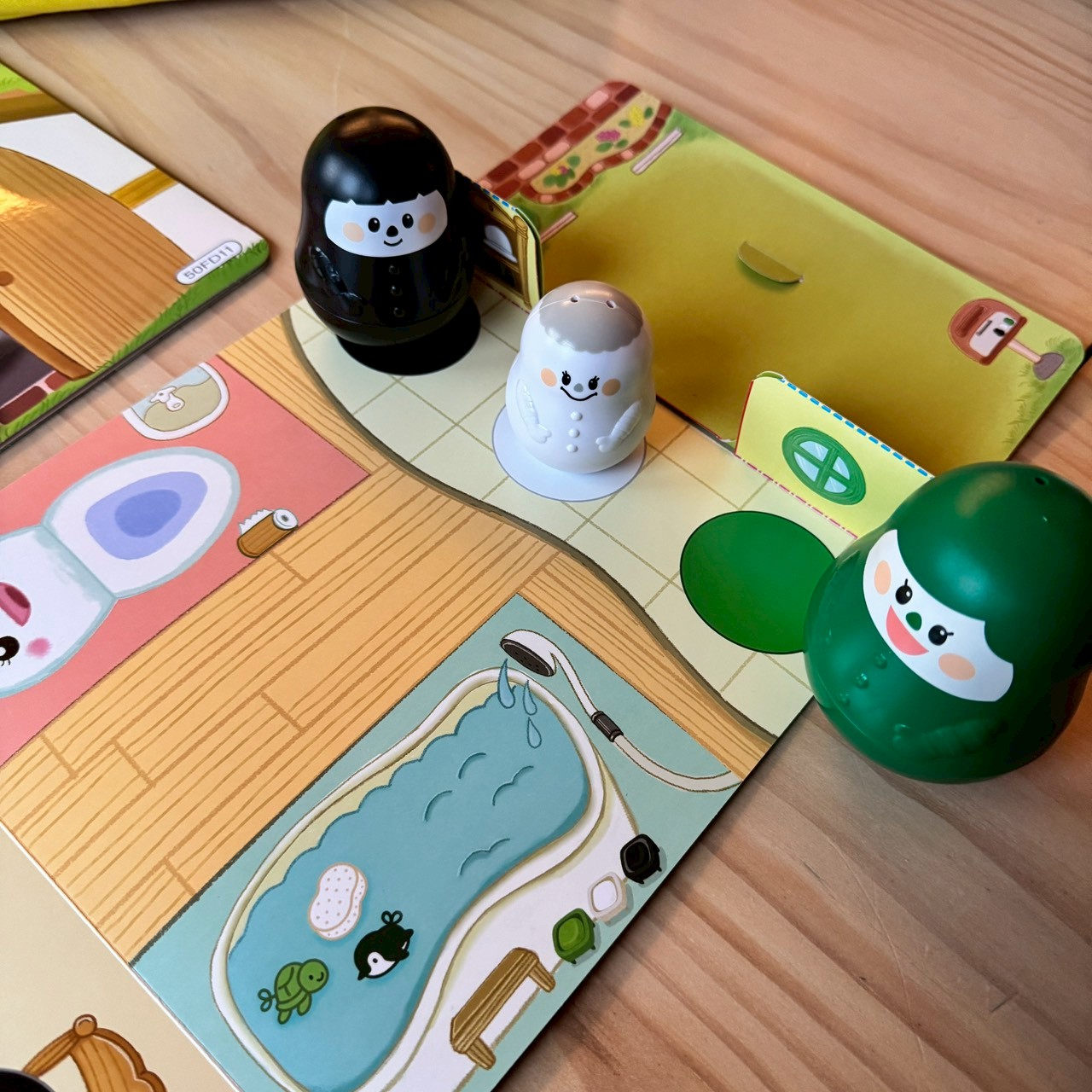 附贈兩張厚質遊戲圖紅黃藍顏色娃娃的家與黑白綠顏色娃娃的家,也是用家家酒開啟對話練習的開始。