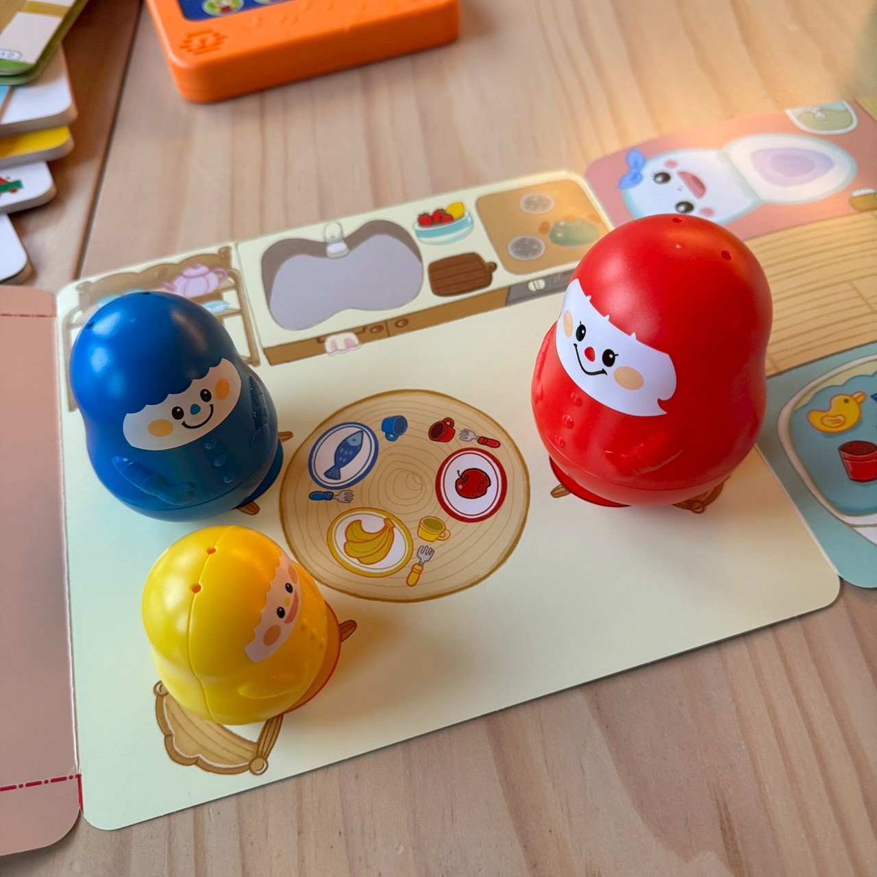 透過對孩子有意義的學習情境才能產生共鳴,當孩子在幫小老鼠們點餐、餵食,也是很好玩的家家酒遊戲,邊玩邊學,也增加了他的語彙量、理解力。