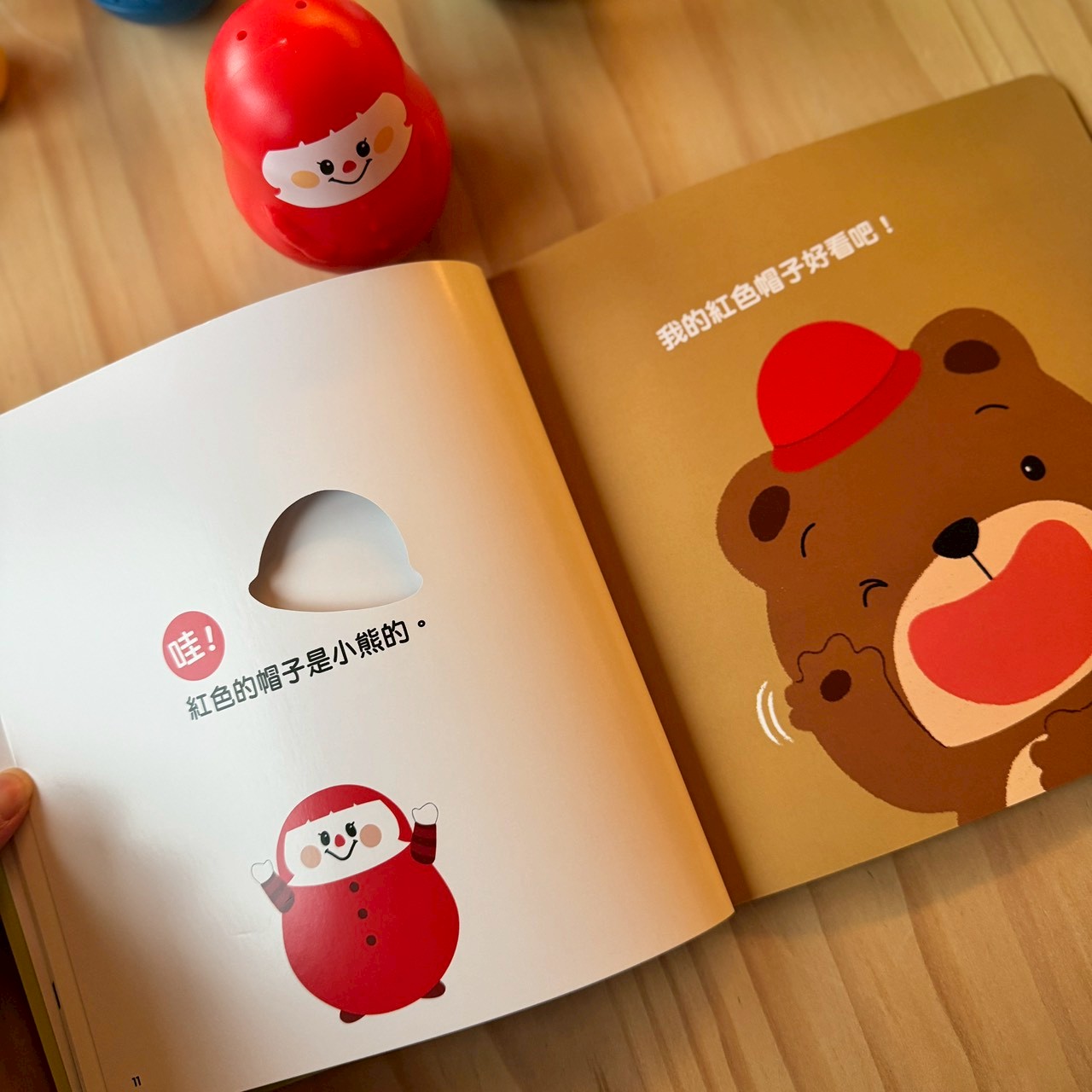 書中的挖洞設計是誘拐孩子開口說的小機關。先看到一個紅色的帽子,讓孩子猜猜是誰?