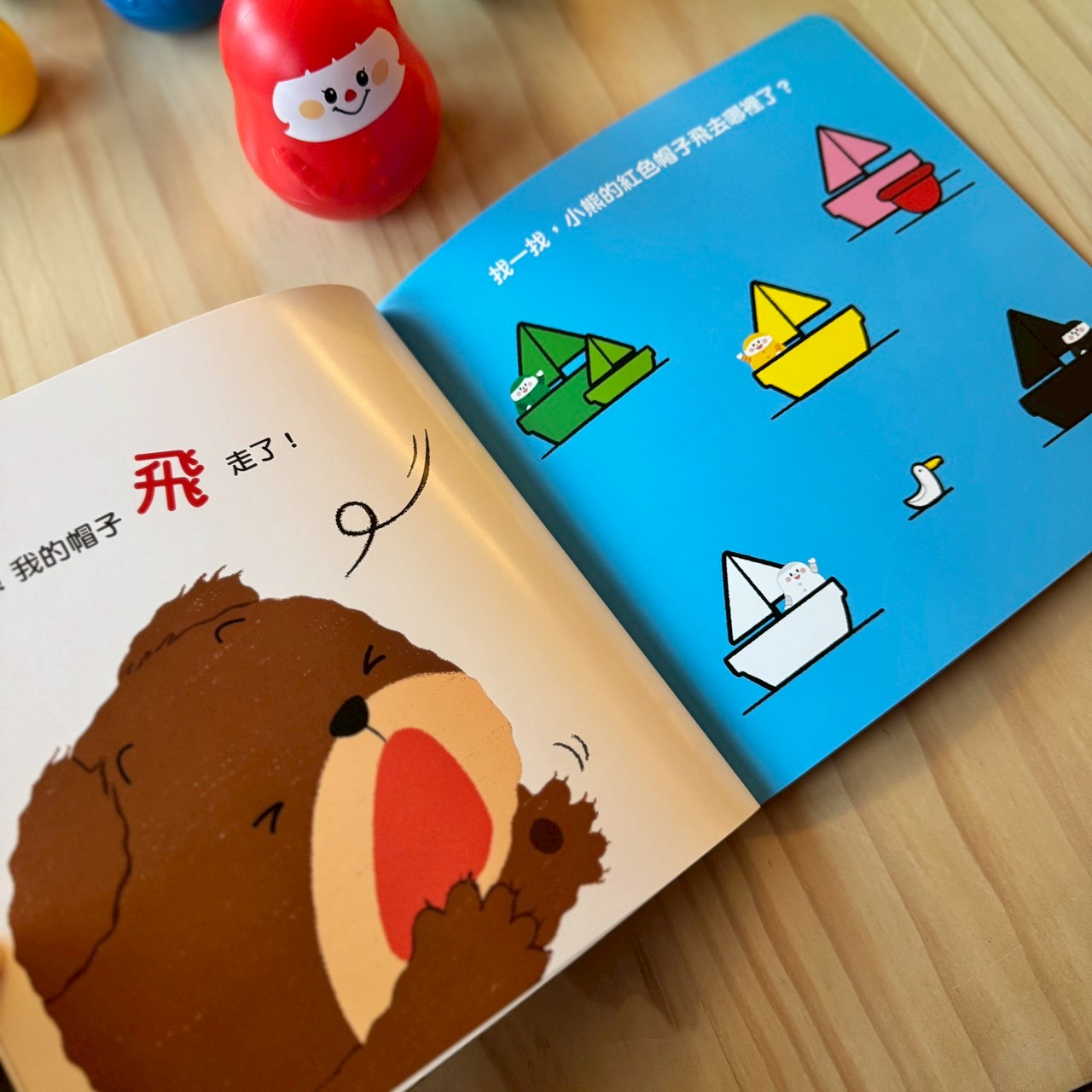 視覺搜尋遊戲:引導孩子說出:「黃色的帽子在黃色的小船上面!」