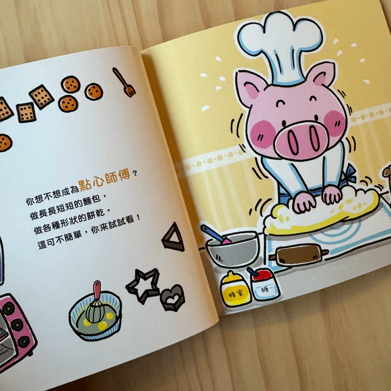 麵包師傅、美髮師的場景,可以帶入大量的形容詞。像是「長長的麵包」、「捲捲的頭髮」,讓孩子的語彙量從名詞擴充到形容詞。