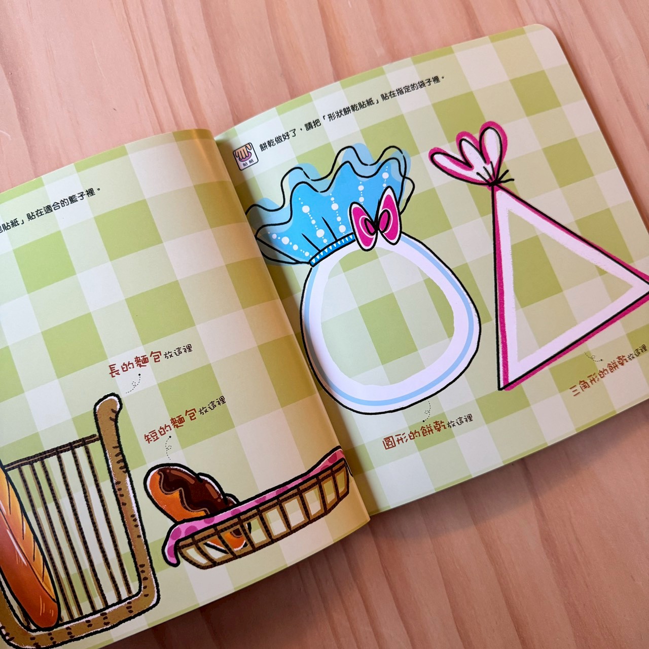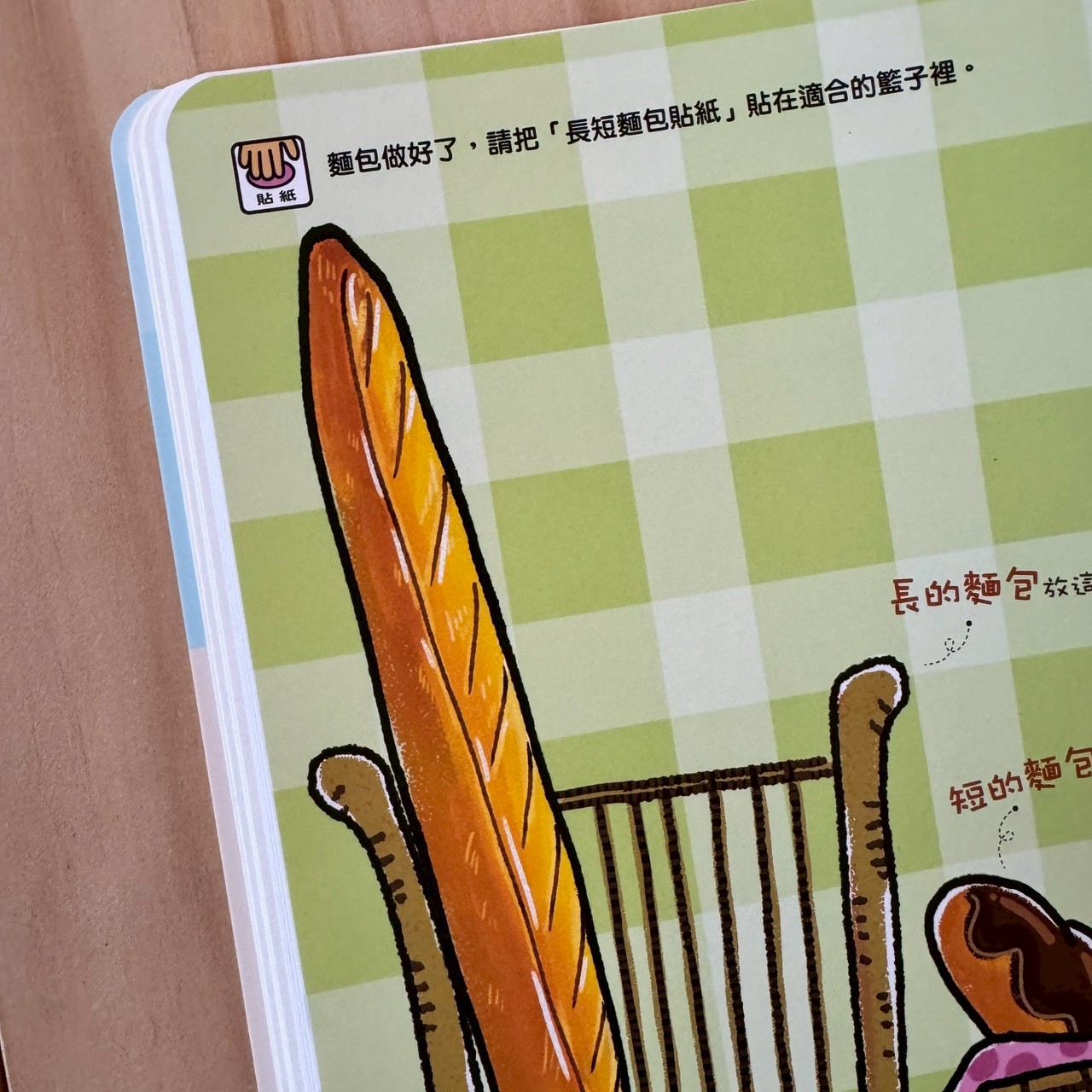 麵包店場景。引導孩子一邊貼一邊說:「我要做一個長長的麵包。」
