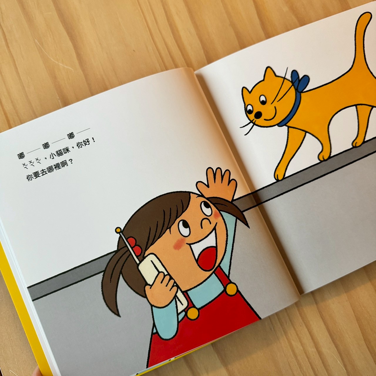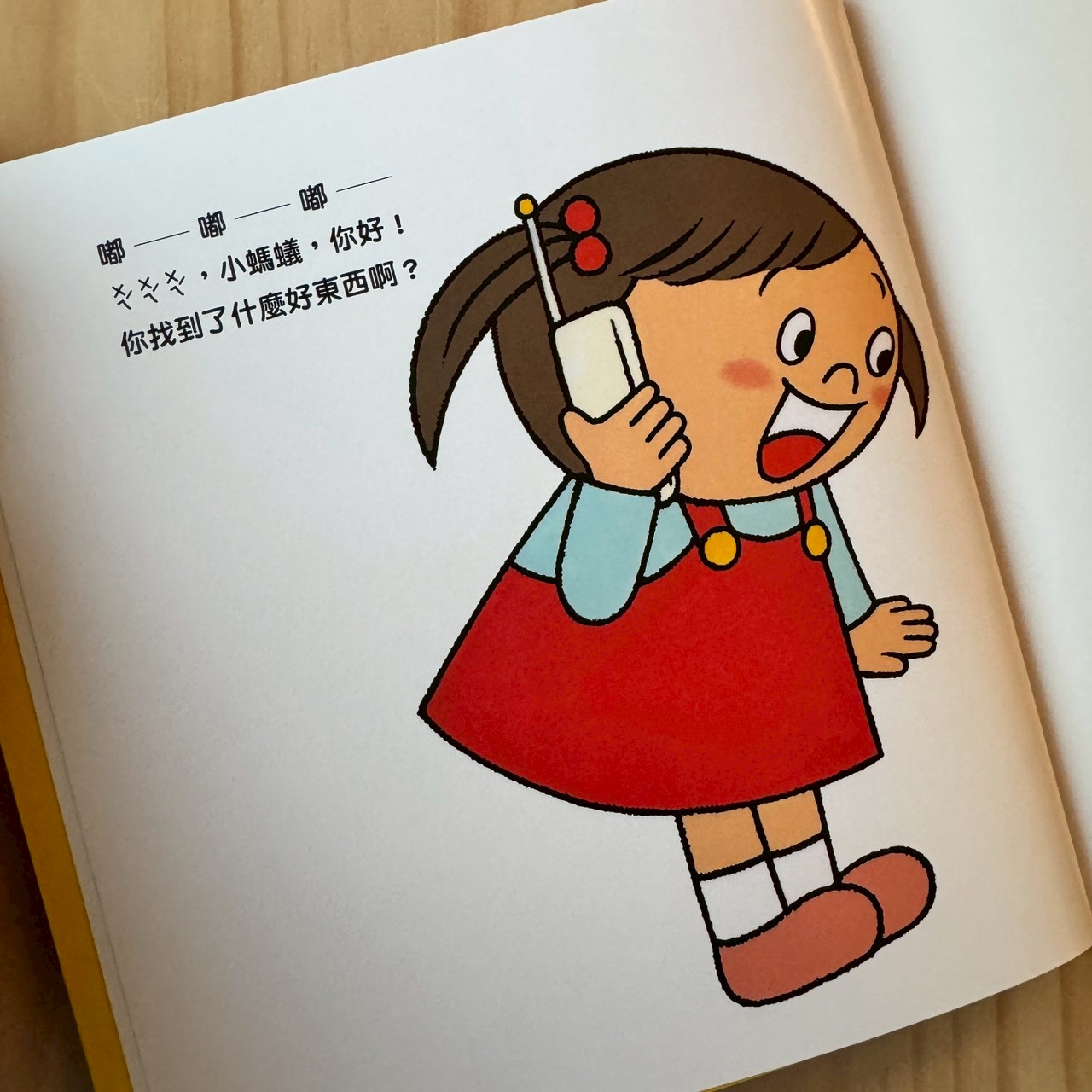 喂喂喂就是我們真實中講電話互動的開頭,很日常,家長可以扮演電話另一頭的動物,問孩子:「妳今天去哪裡玩呀?」