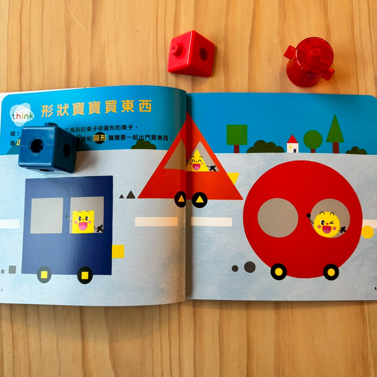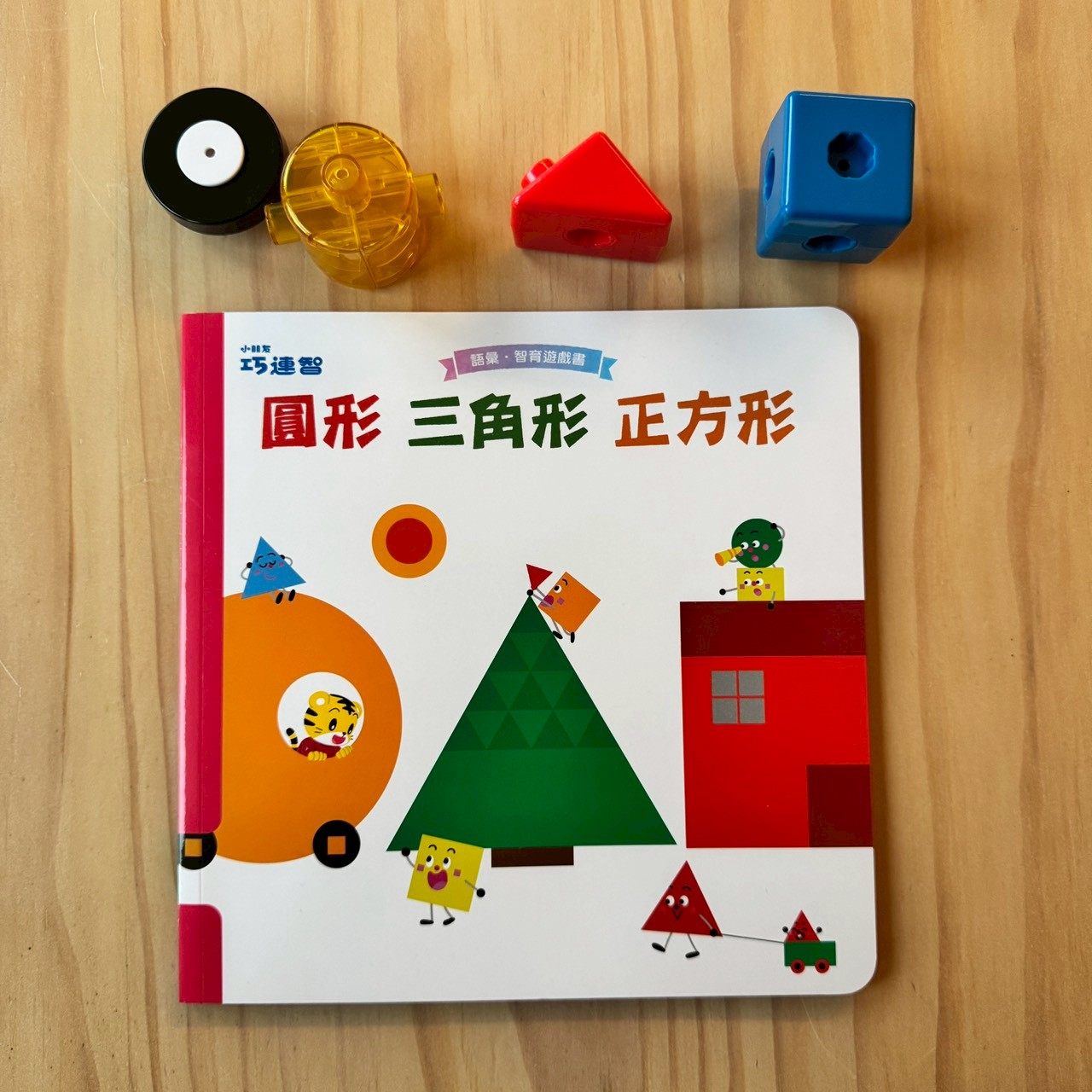 也能做形狀辨識遊戲, 指著三角形積木說:「看!這是有三個尖尖角的是三角形!」