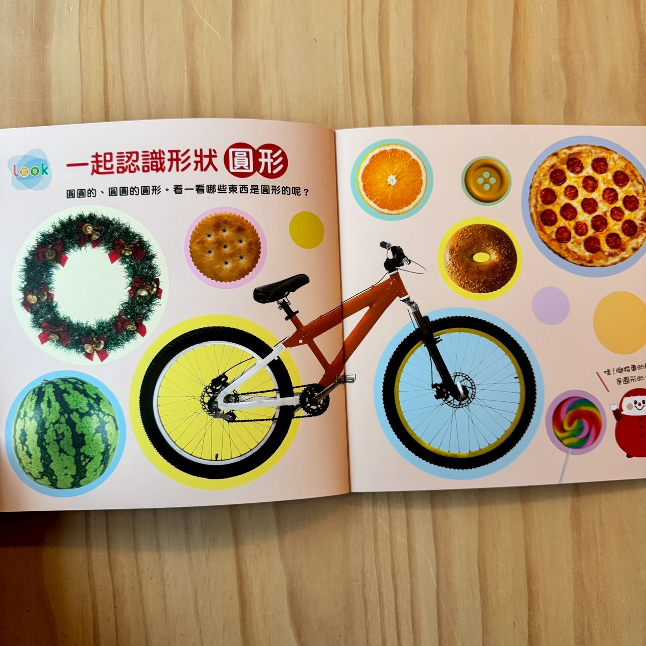 接著引導孩子在頁面中尋找真實物件(如飯糰、比薩),這就是感官連結。