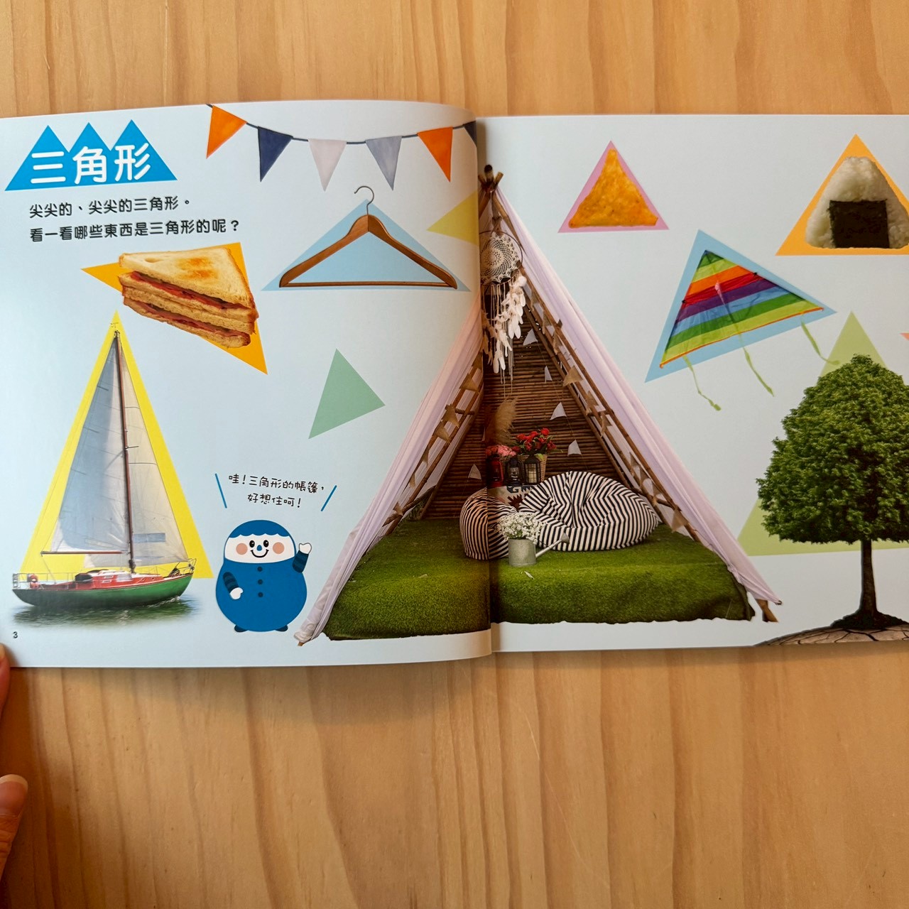 帶孩子理解書中對應的形狀物體。數數看:「1, 2, 3,有三個尖尖角的是三角形。」
