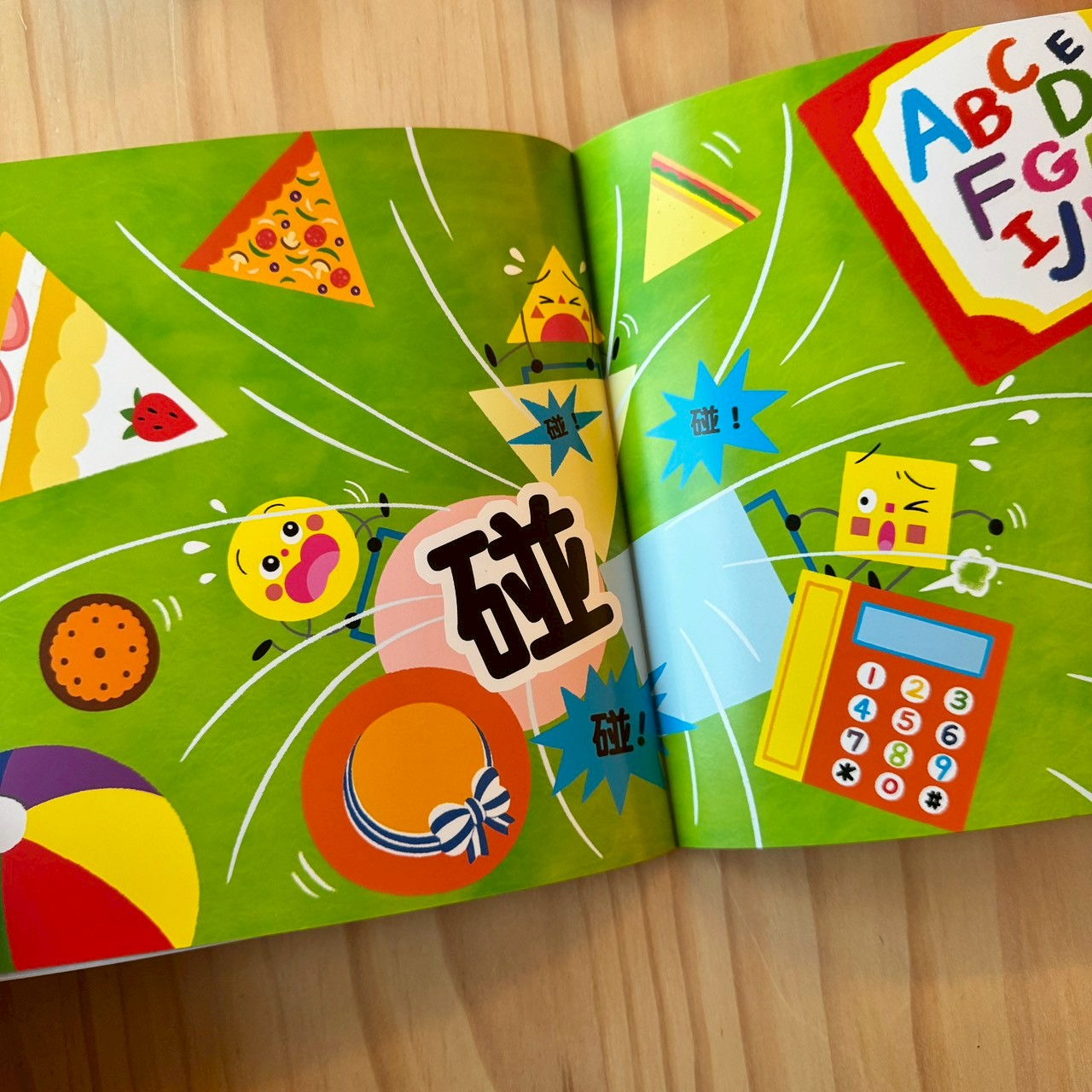 最後一頁的「碰撞(砰!)」非常吸引孩子,利用動態感讓形狀變得很活潑。
