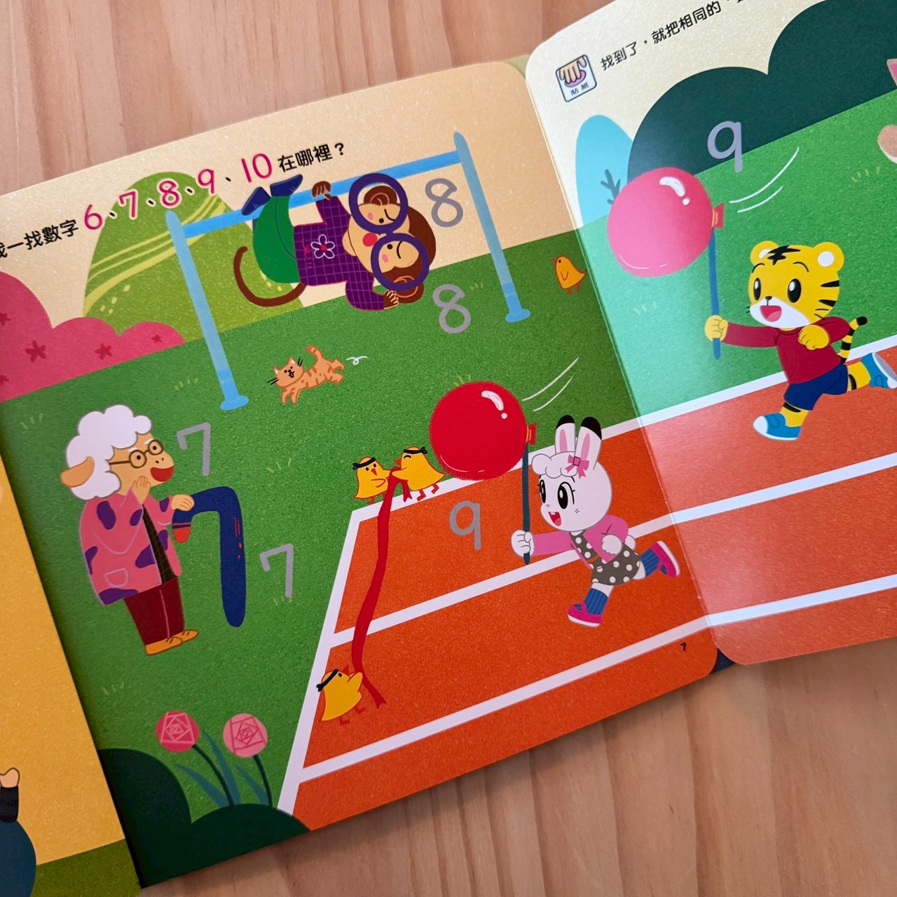 「找一找數字在哪裡」這頁,將數字隱藏在運動場的場景中。這能訓練孩子的視覺專注力,當孩子指著9號跑道大喊時,他對符號的記憶是伴隨著成功的喜悅。