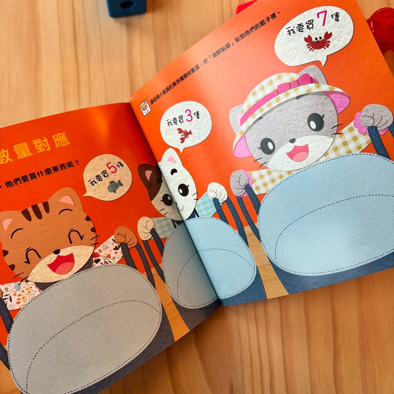 購物遊戲,也是小孩的最愛。引導孩子說:我要買 5 條魚,然後當小老闆,開始數好數量發放給客人吧!