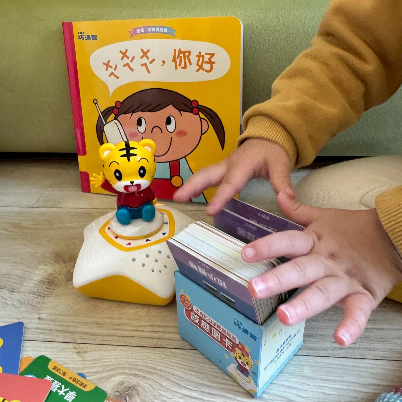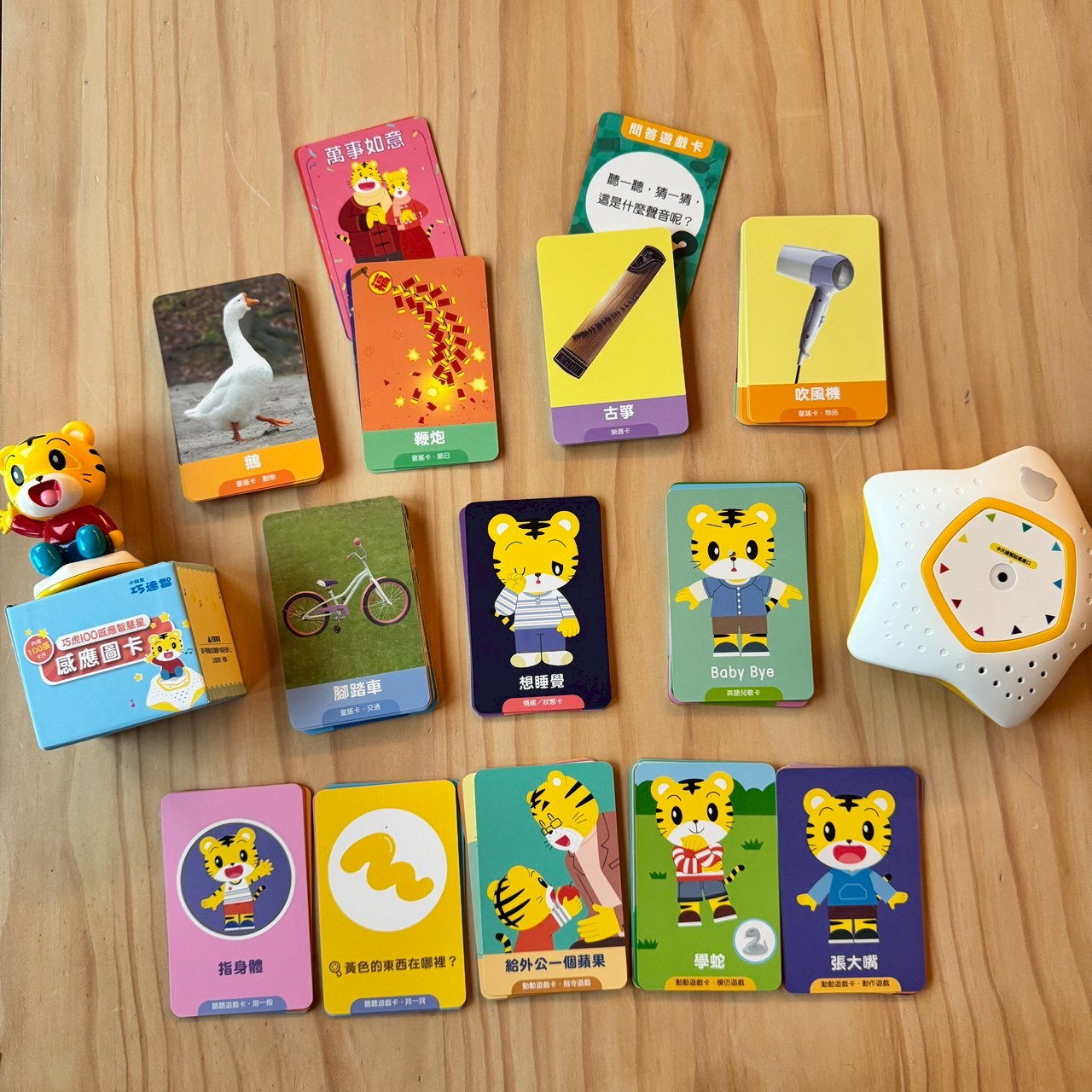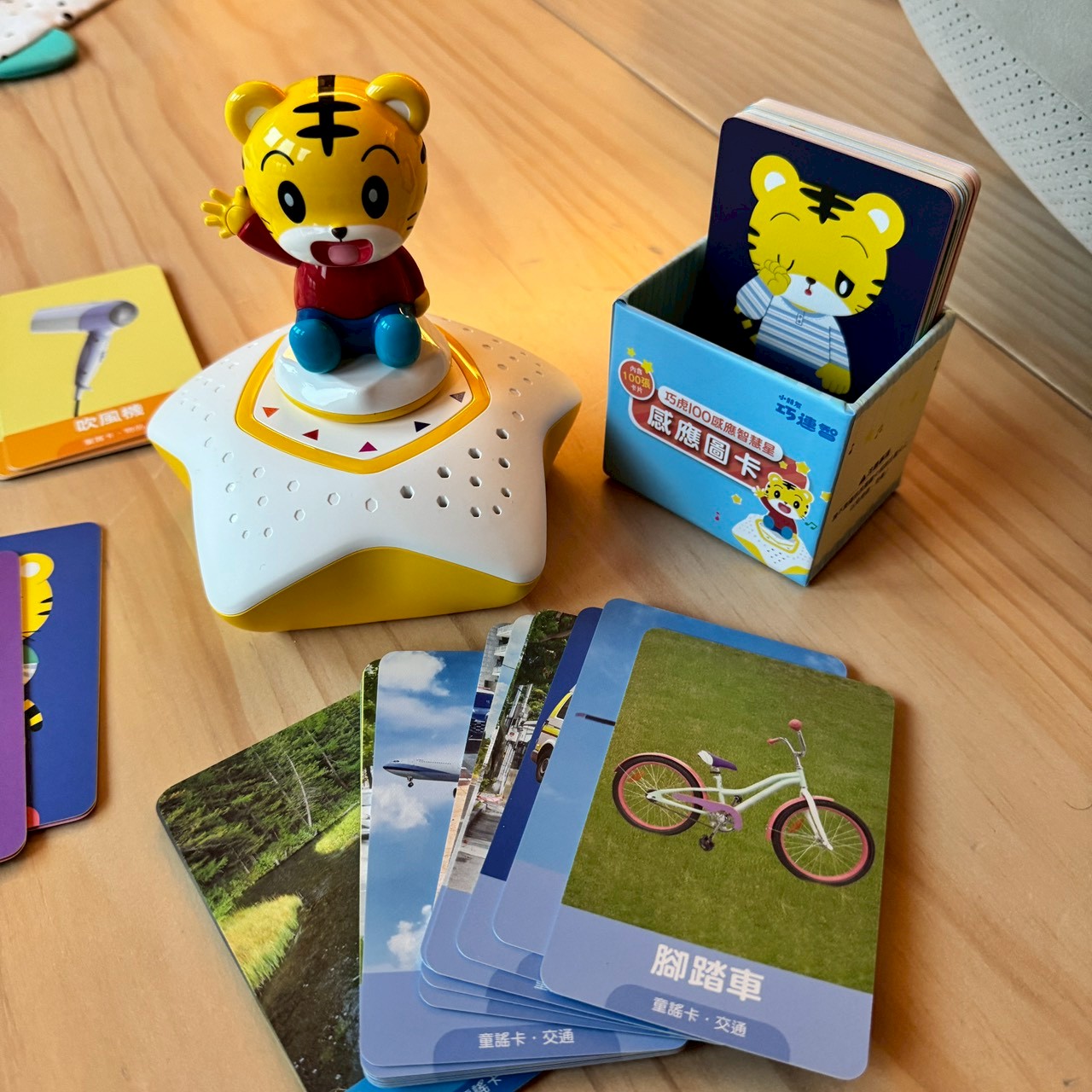 除了圖卡,星星底座設計圓潤,刷卡儀式感十足,搭配站立在上面的巧虎公仔,放上後可以聽音樂,小卡也有收納盒,所有卡片玩完後通通裝進藍色小盒子裡,快速又不佔空間。