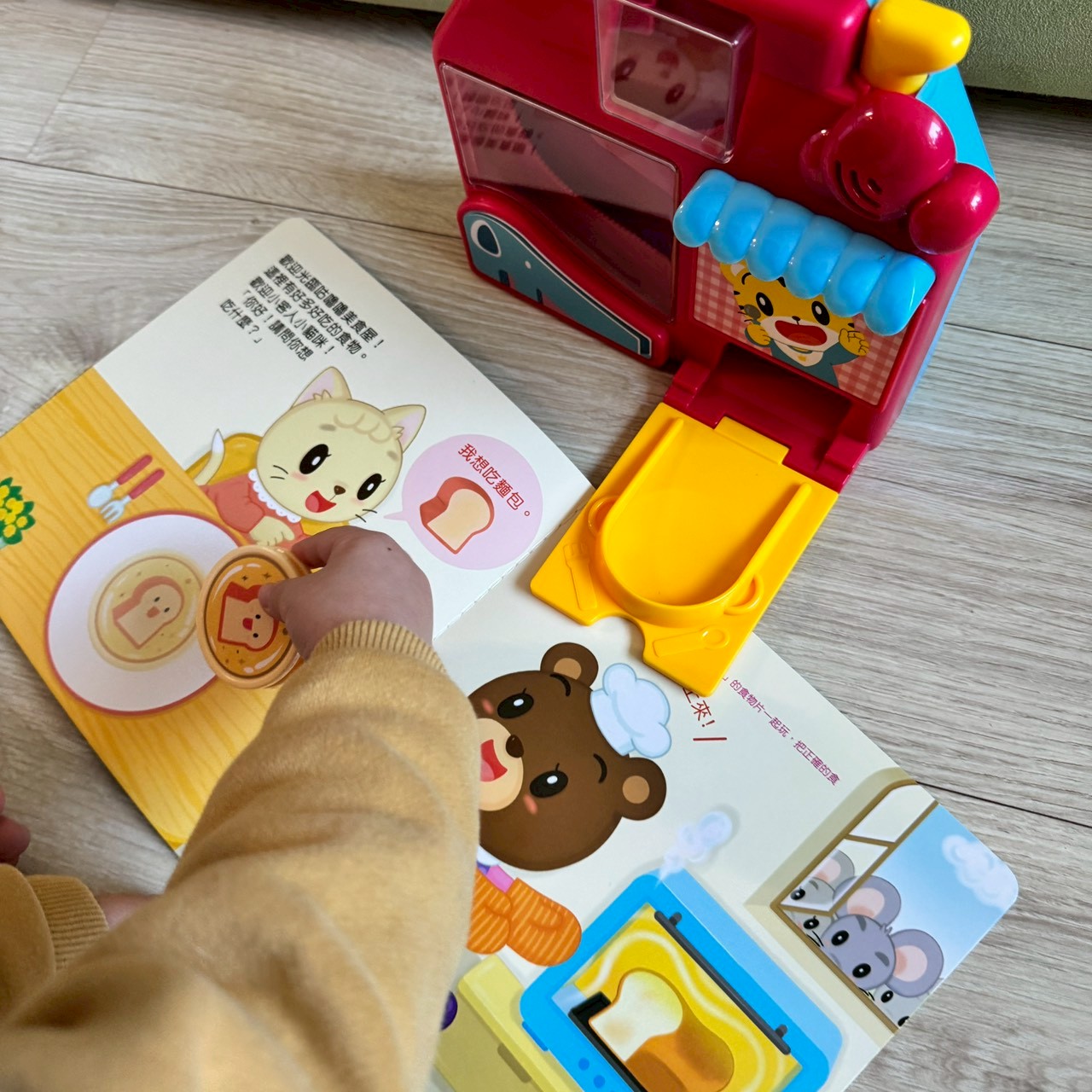 當孩子投入米飯片時,對應書中小老鼠喊著我想吃米飯的頁面,這讓語言學習與孩子周遭的生活息息相關,引發他自我表達的興趣。