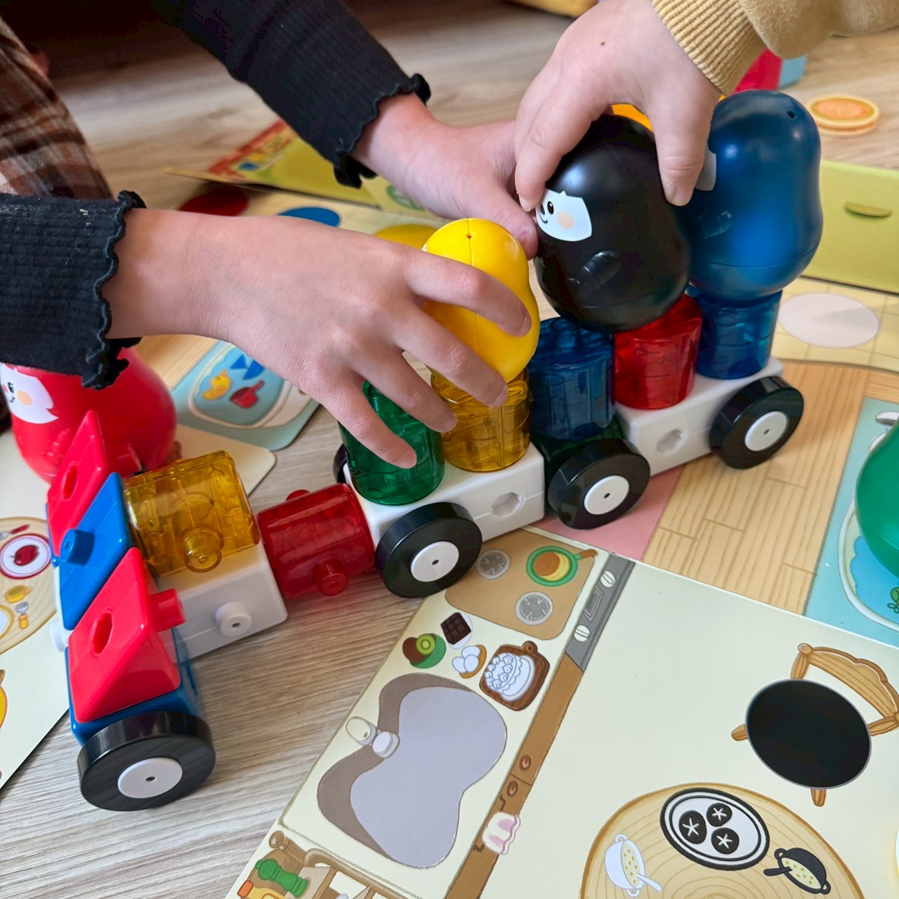 把積木蓋成火車,載著顏色娃娃去郊遊。 這種有意義的學習情境,會讓孩子的想像力與語彙量同步增加!