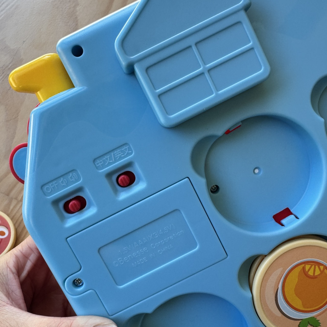 翻到美食屋的背面,可以看到貼心的功能切換鍵:不僅可以調整兩段音量,還能切換「中文/英文」模式。