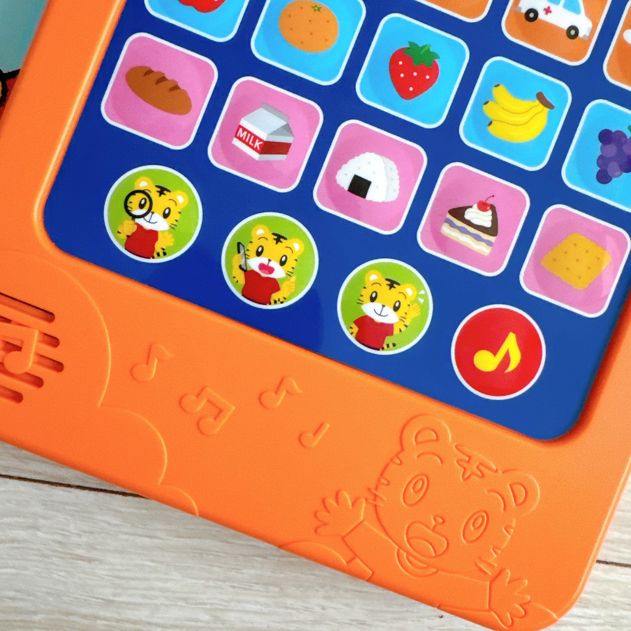面板上有 15 個彩色語彙按鍵,包含大象、獅子、自行車、救護車,以及孩子最愛的蘋果、草莓、飯糰。