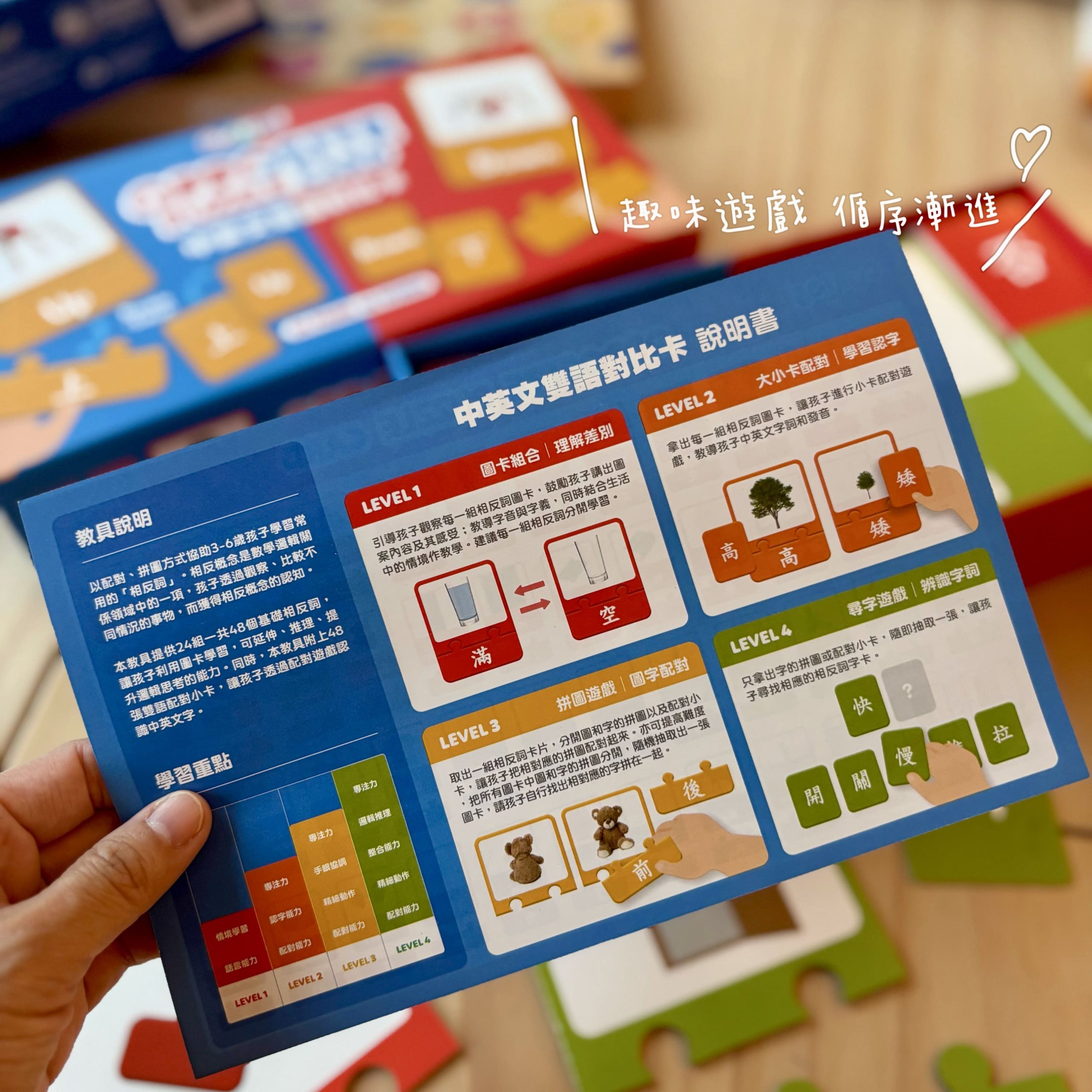 我製作過許多三階段字卡的早教資源給讀者,但很多人告訴過我卡片好多裁剪好累,不見得有完成字卡😅 在蒙特梭利的教室裡,我們很強調「環境」與「教具」的品質。很多家長常問我:「大V,家裡不可能像教室一樣擺滿專業教具,有沒有適合居家、有質感,又能延續蒙特梭利精神的選擇?」 這次接觸到來自香港的 Curios,我覺得很像是為了孩子發展需求而設計的「微型教具」。從設計的美感、圖片的真實性,到操作的邏輯,都非常符合我心中對於「Play to Learn」的標準,蠻多部分是符合蒙特梭利理念。
