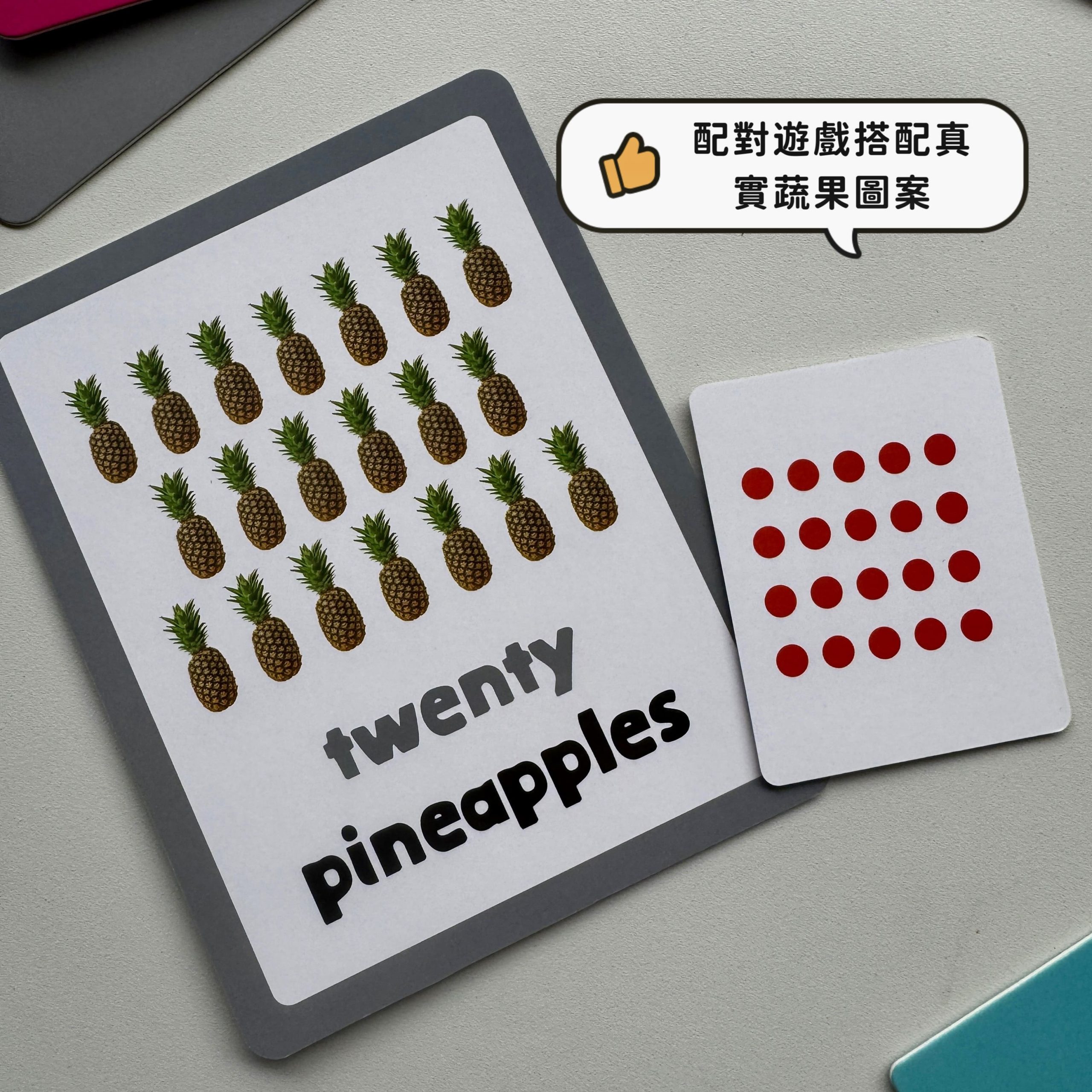 配對遊戲搭配真實蔬果圖案,結合蒙特梭利理念,讓孩子逐漸建立數感