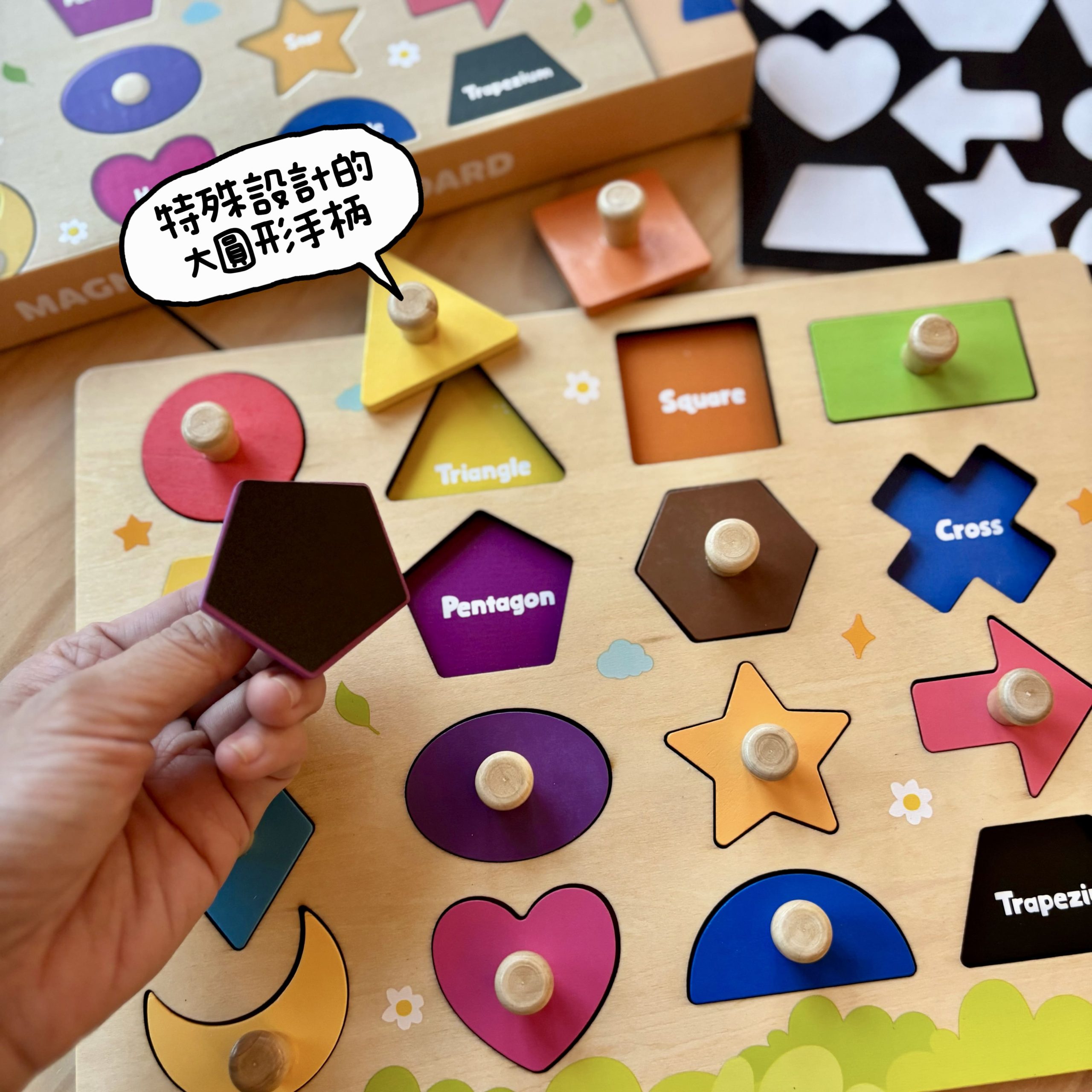 每一塊拼圖都配有特殊設計的大圓形手柄,方便孩子抓握,並訓練手部肌肉力量。