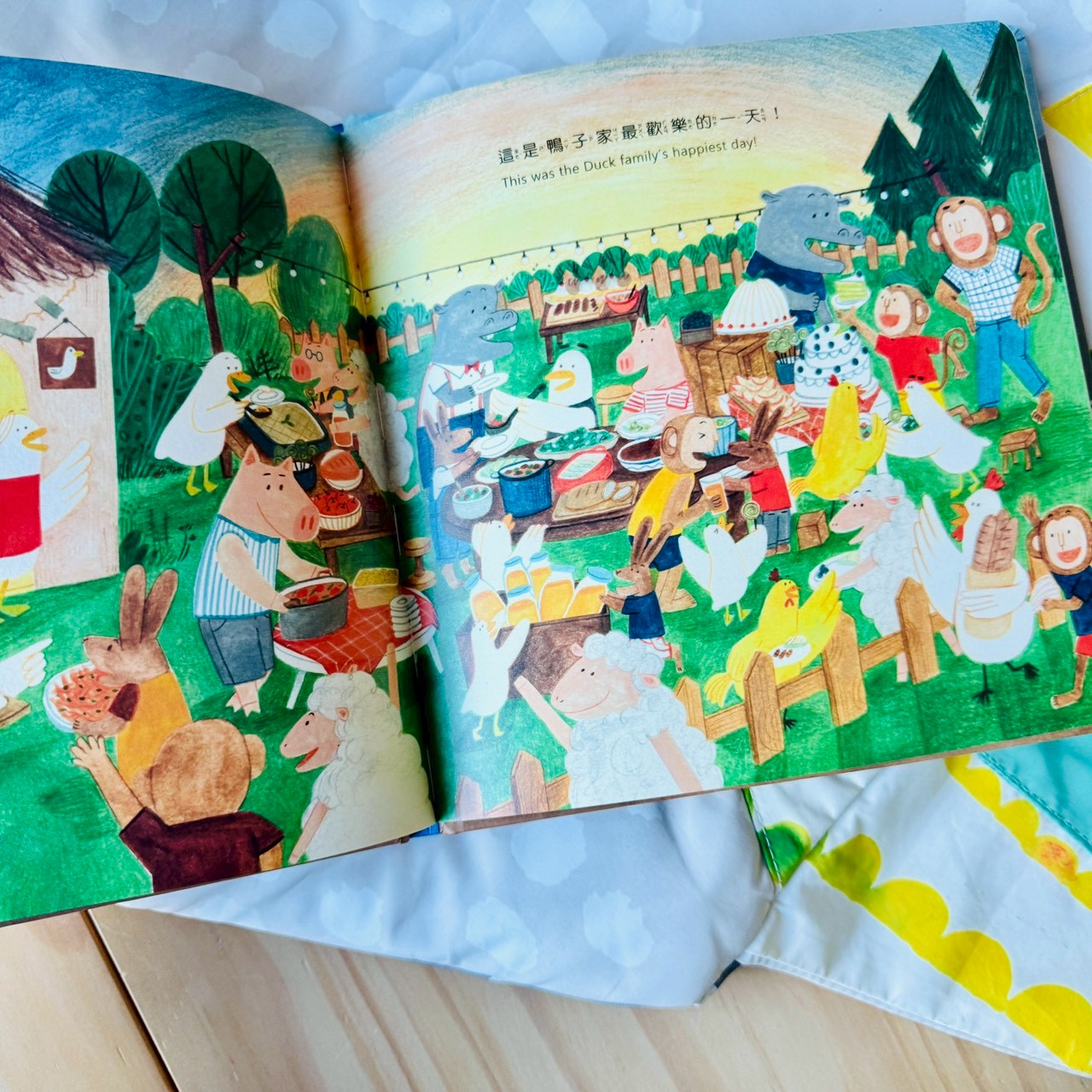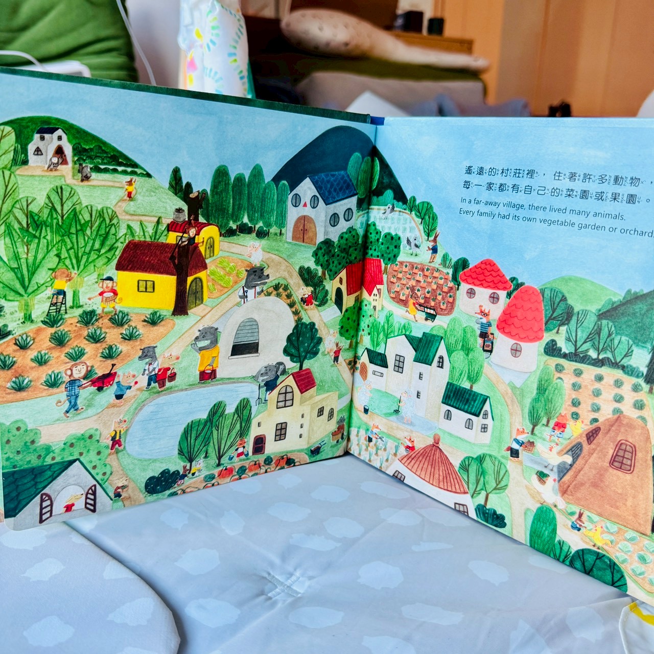 故事一開始,其實沒有在講吃不吃菜。畫面先帶孩子看到一整個村莊,大家各過各的日子,有聊天、有工作,看起來很熱鬧、也很正常,但畫面停在鴨子爸爸的菜園。