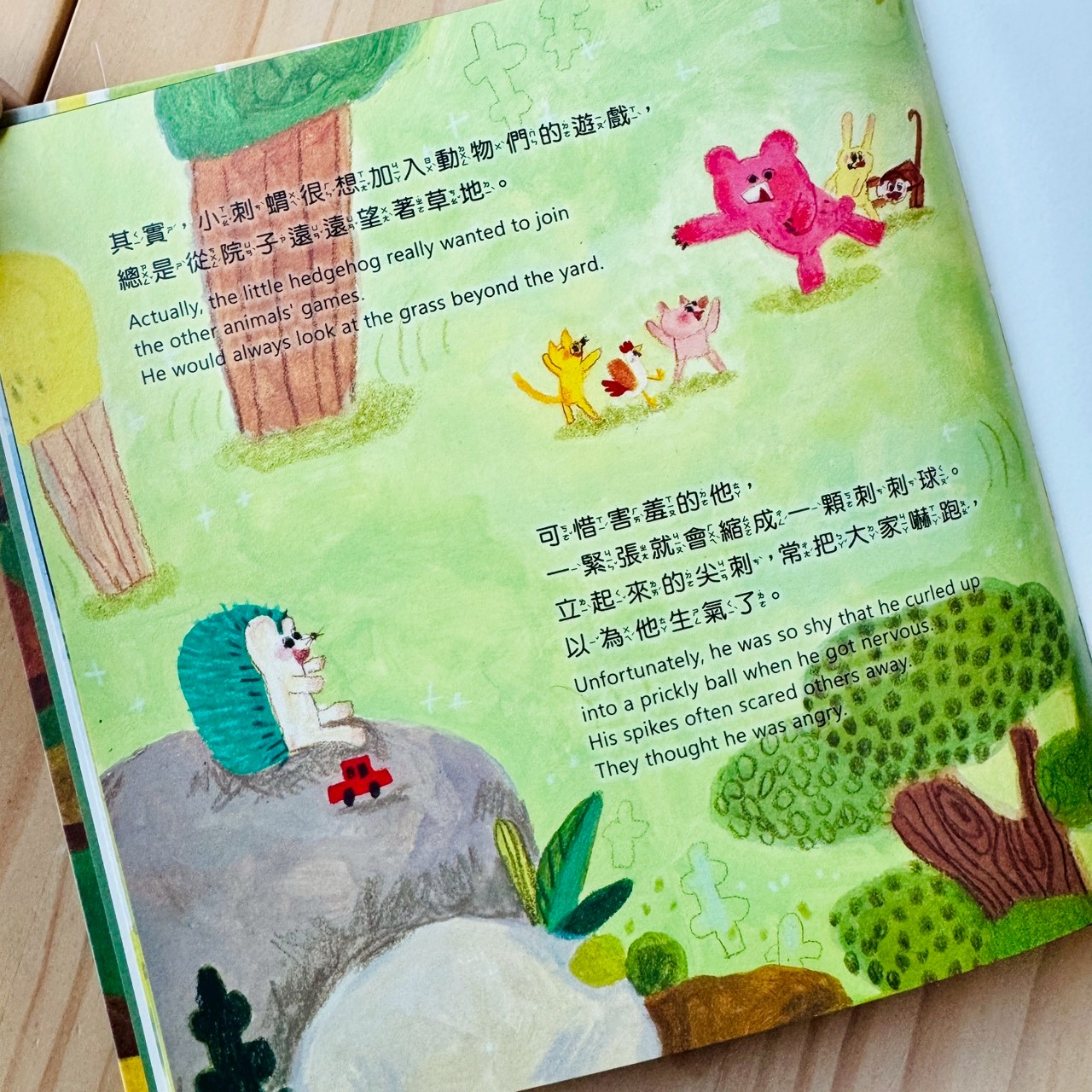 從一開始全身都是刺、容易誤會別人,到後來願意靠近、一起玩。
