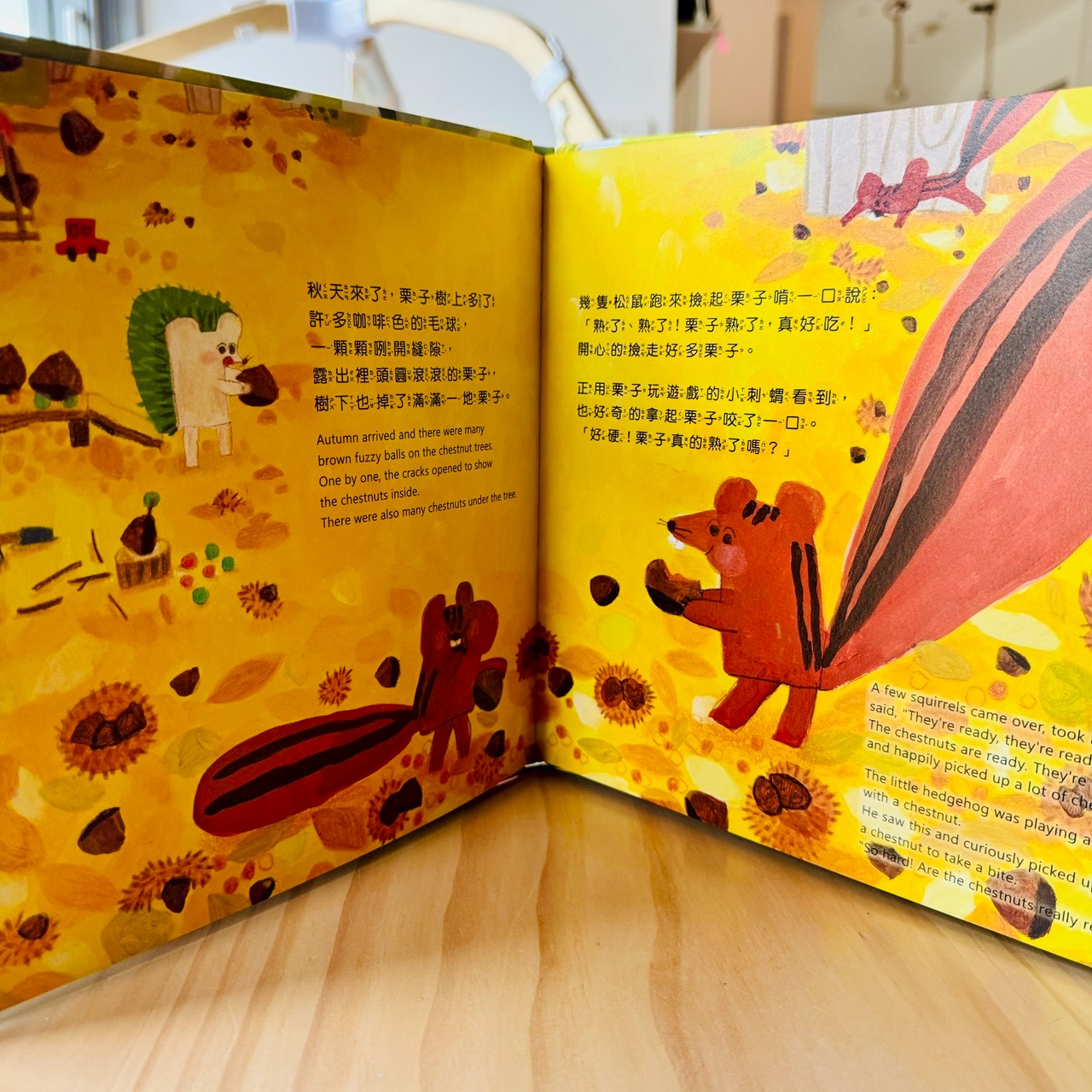 秋天到了,栗子一顆一顆掉在地上,畫面一下子變得很亮,色調很秋天。