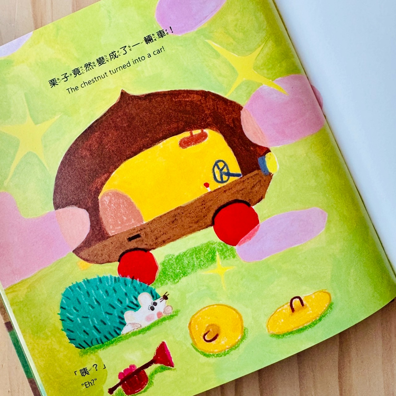 前面還在撿栗子、玩聲音,下一頁畫面直接跳轉,栗子不只是被玩,而是被想像成一個可以動、可以載人的魔法玩具。