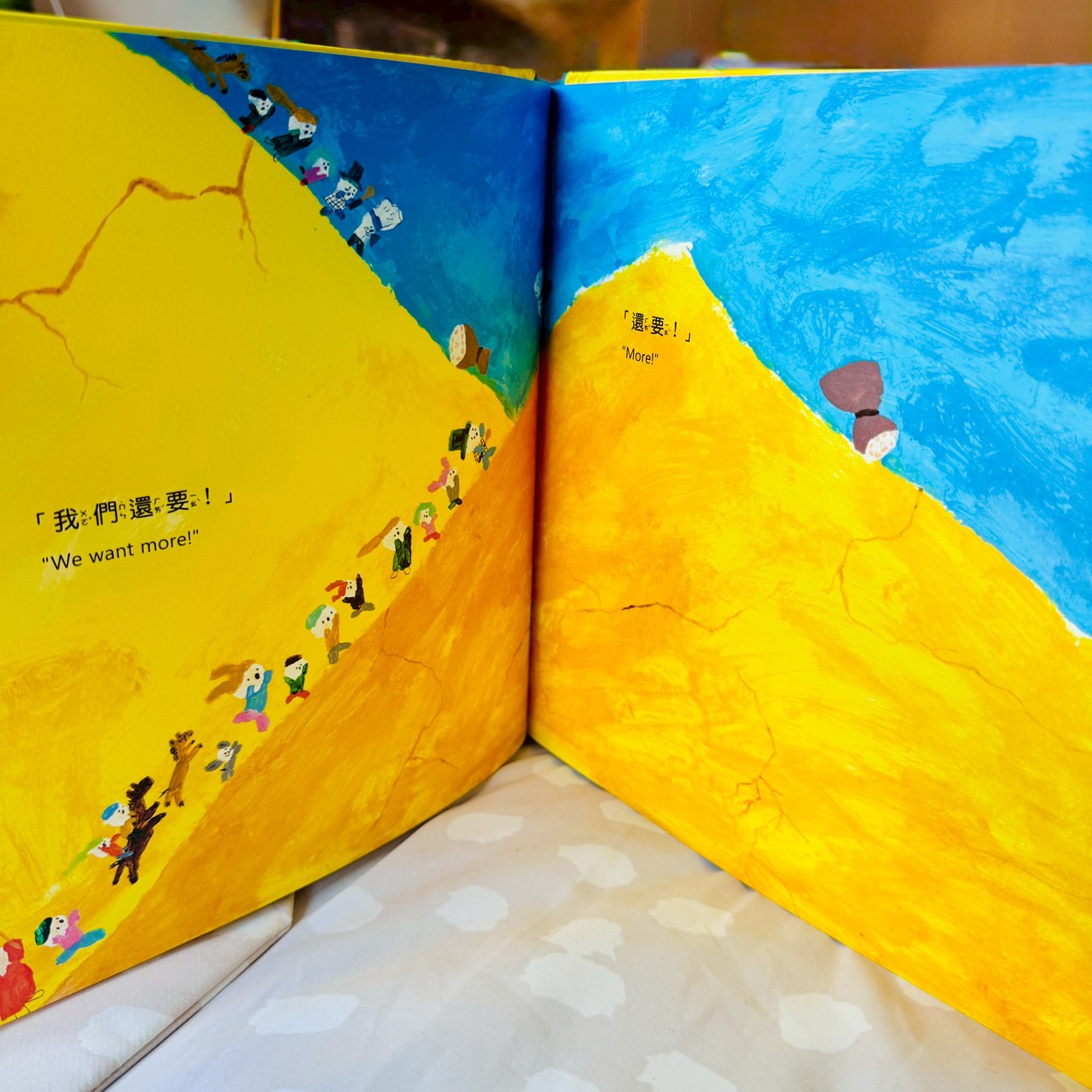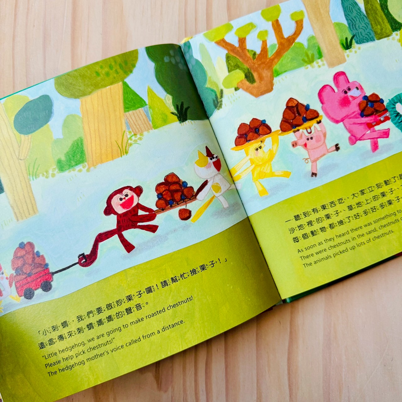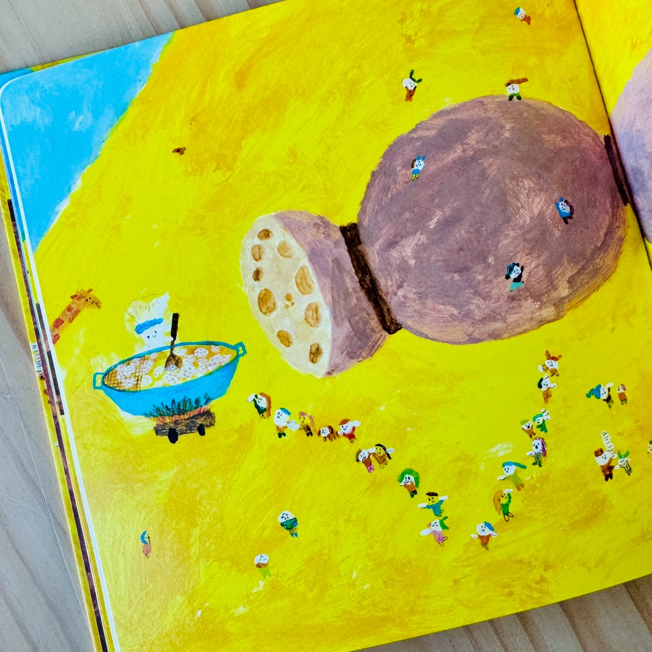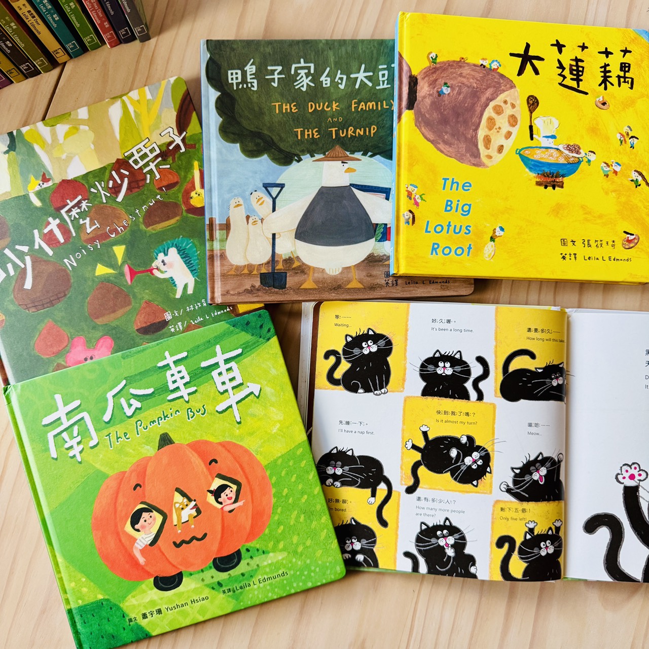 蓮藕不只是一節一節被吃掉的菜,而是一整條藏在泥裡、最後還能開出花的存在;大頭菜讓孩子立刻想到《拔蘿蔔》,一個人不行,就找朋友一起;栗子一定要炒才會熟,卻被孩子聽成「吵」,乾脆把吵吵鬧鬧變成一起長熟的過程;南瓜圓圓的、能裝人,直接變成一台載著大家去旅行的車;花生用孩子一聽就懂的諧音梗,聊倒楣、等待,還有慢慢變好的可能。