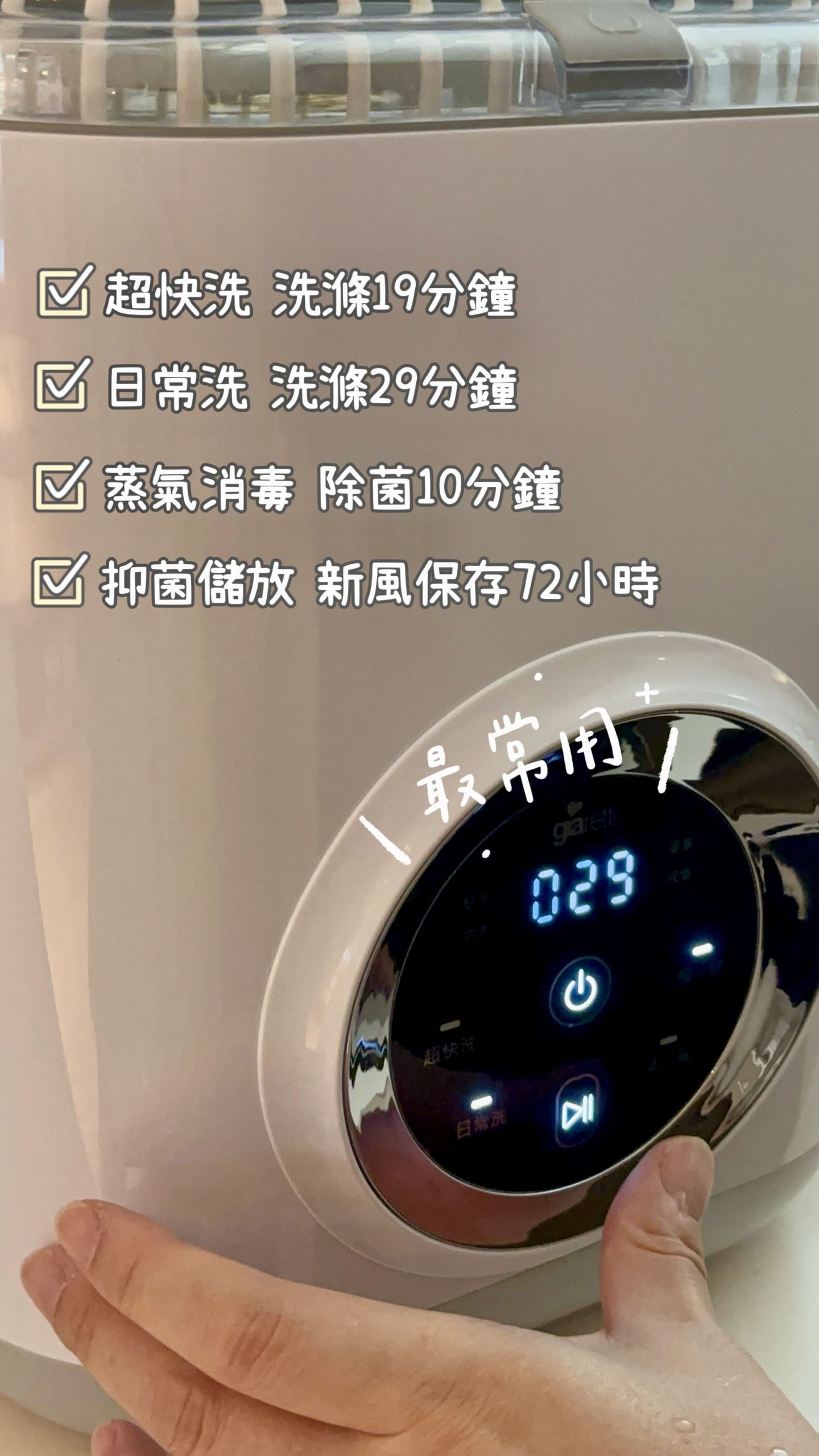 我最常用的是29分鐘日常洗模式(不含消毒+烘乾)趕時間還有19分鐘模式,洗完後會進入10分鐘的消毒模式+45分鐘的烘乾模式,烘乾後會轉為保管模式,72hr高密度濾網送風,不怕悶在機器裡有異味,一鍵搞定效率滿分省去好多步驟(手比愛心)