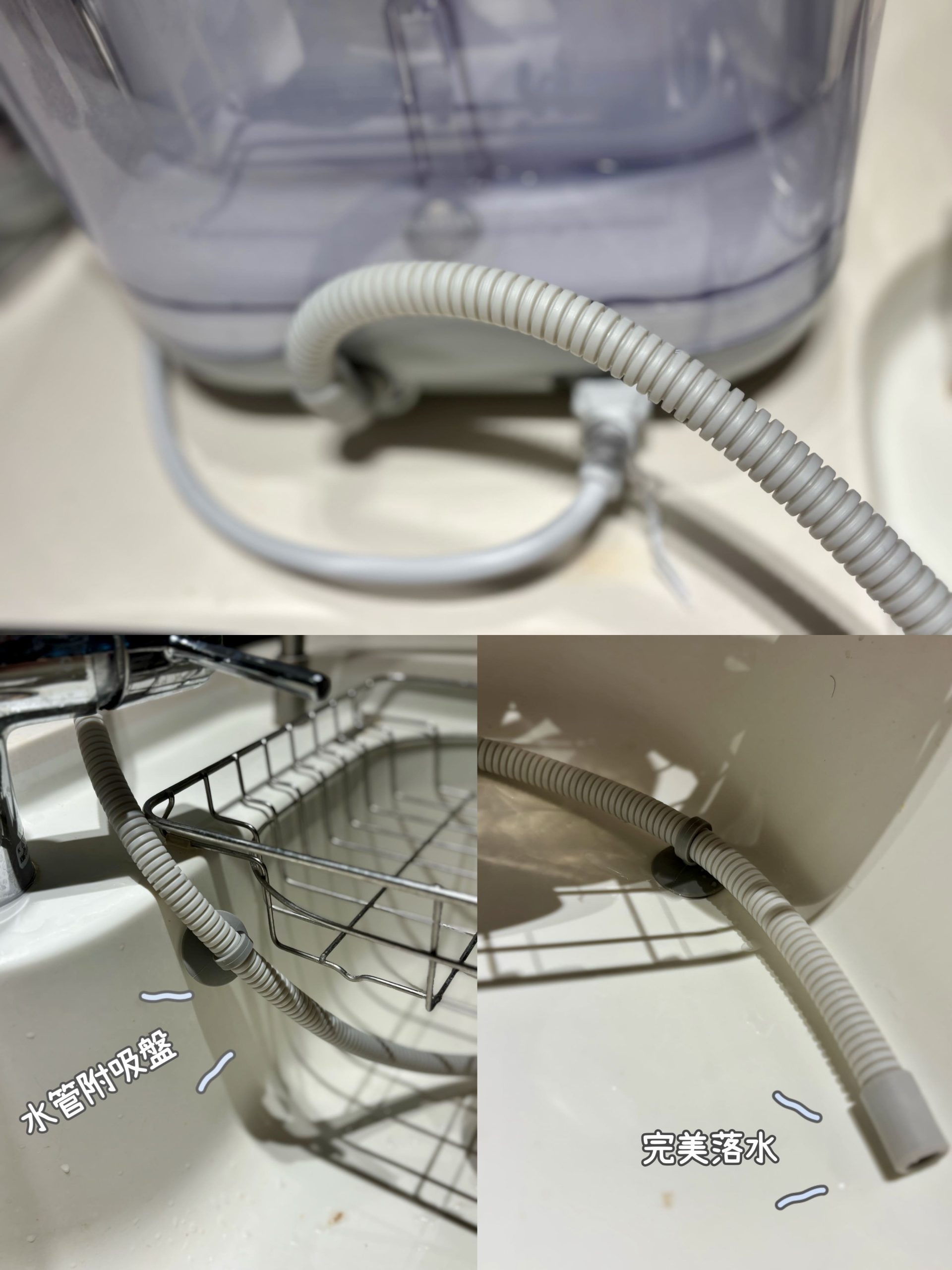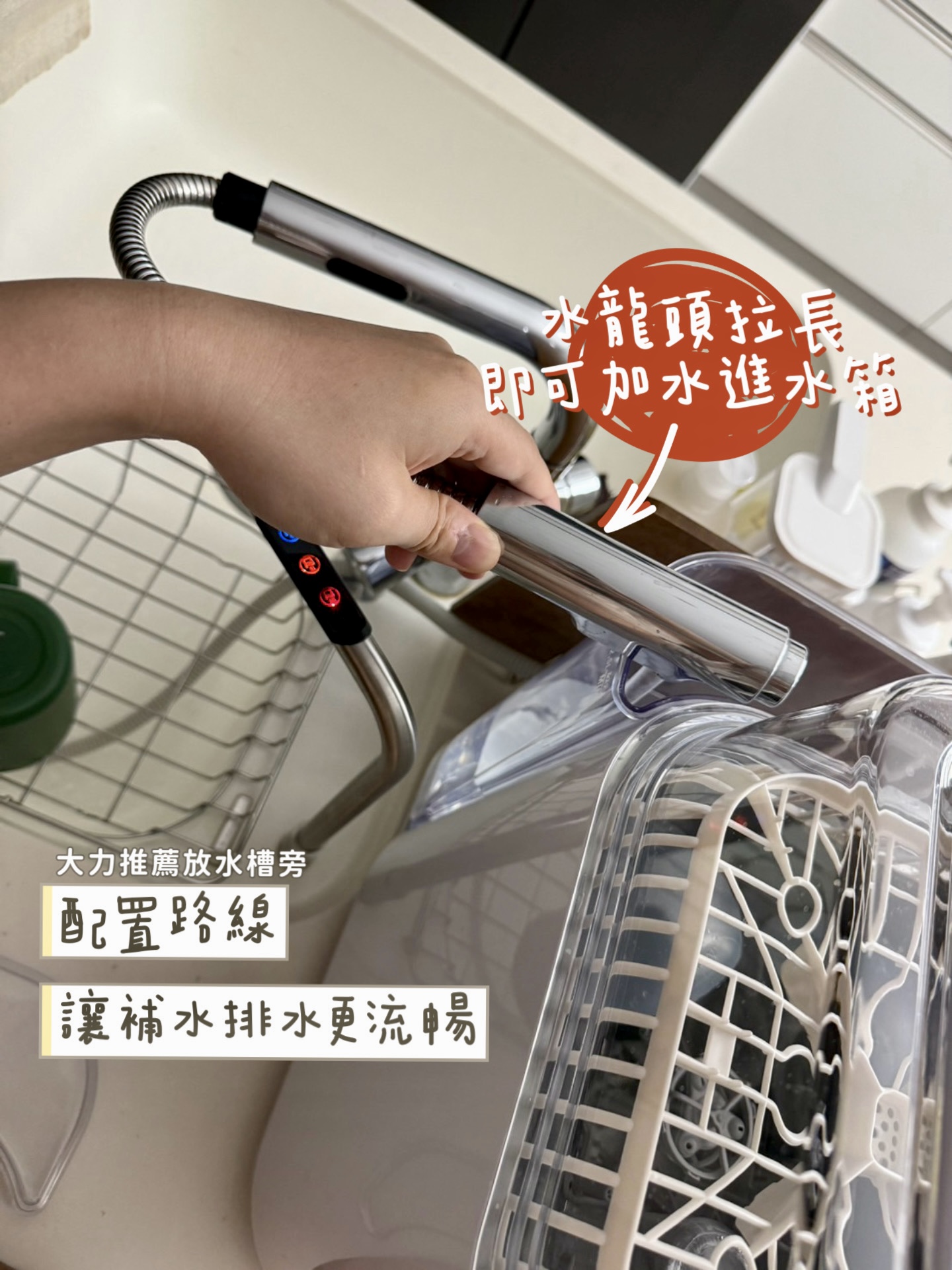 我把這台洗奶瓶機放在流理臺旁邊,用水龍頭拉長即可水箱,把排水管拉到水槽裡就是完美的落水。
