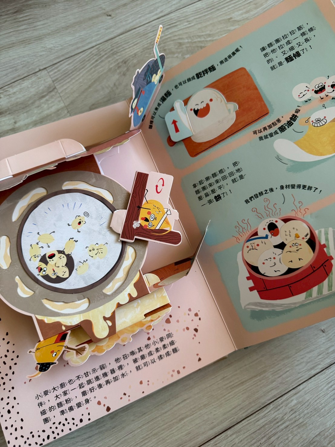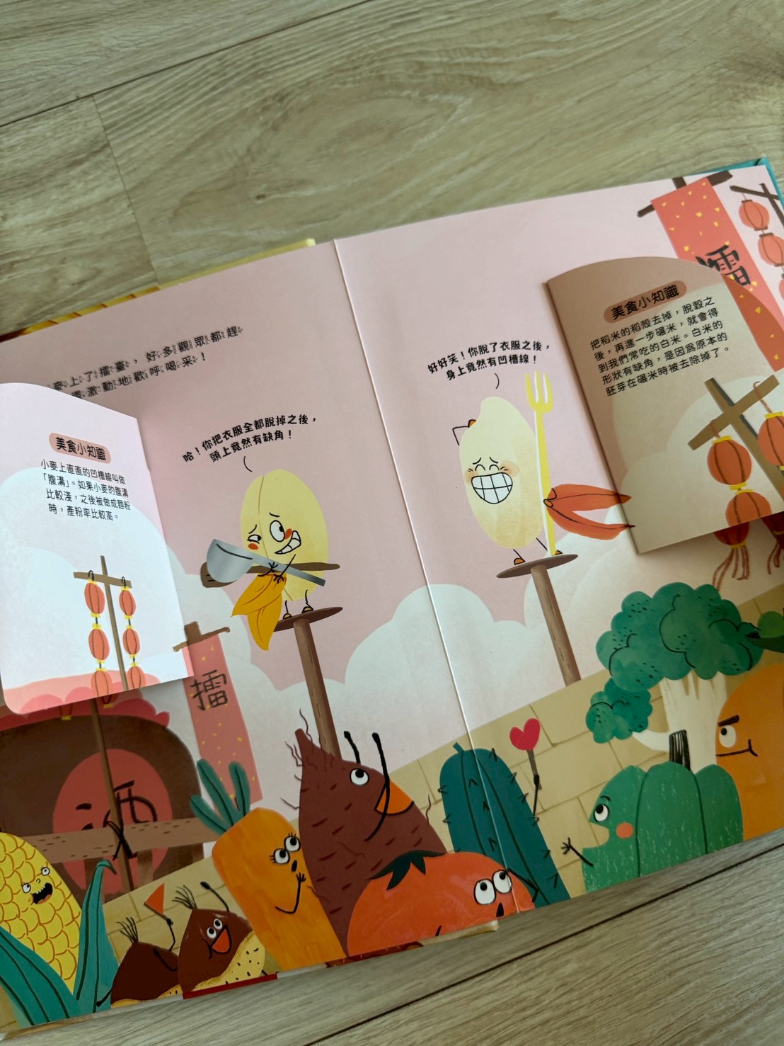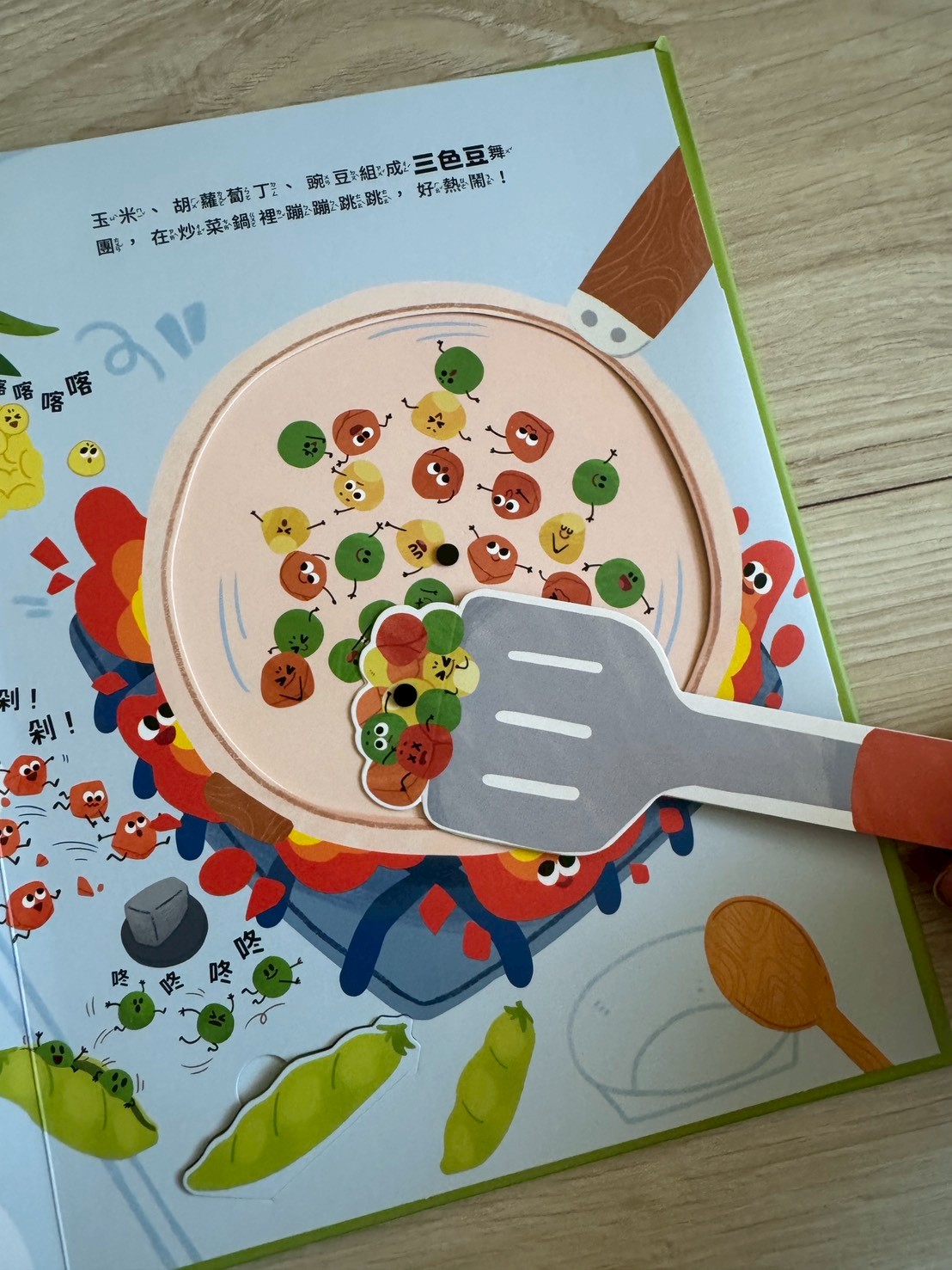 透過立體操作機關,這套書把「食物從哪裡來」描述得很具體,比如一起磨小麥;馬鈴薯跳進油鍋變薯條;蔬菜從田裡採收、進市場、回家洗洗切切;肉乾在火爐上跳恰恰、認識肉的部位。