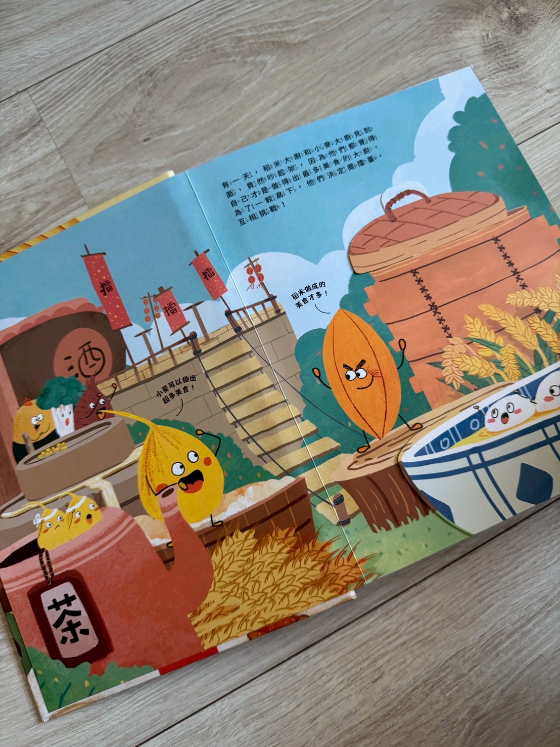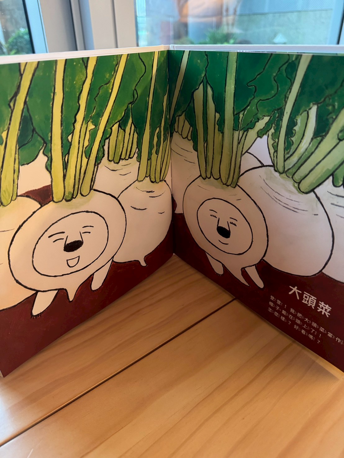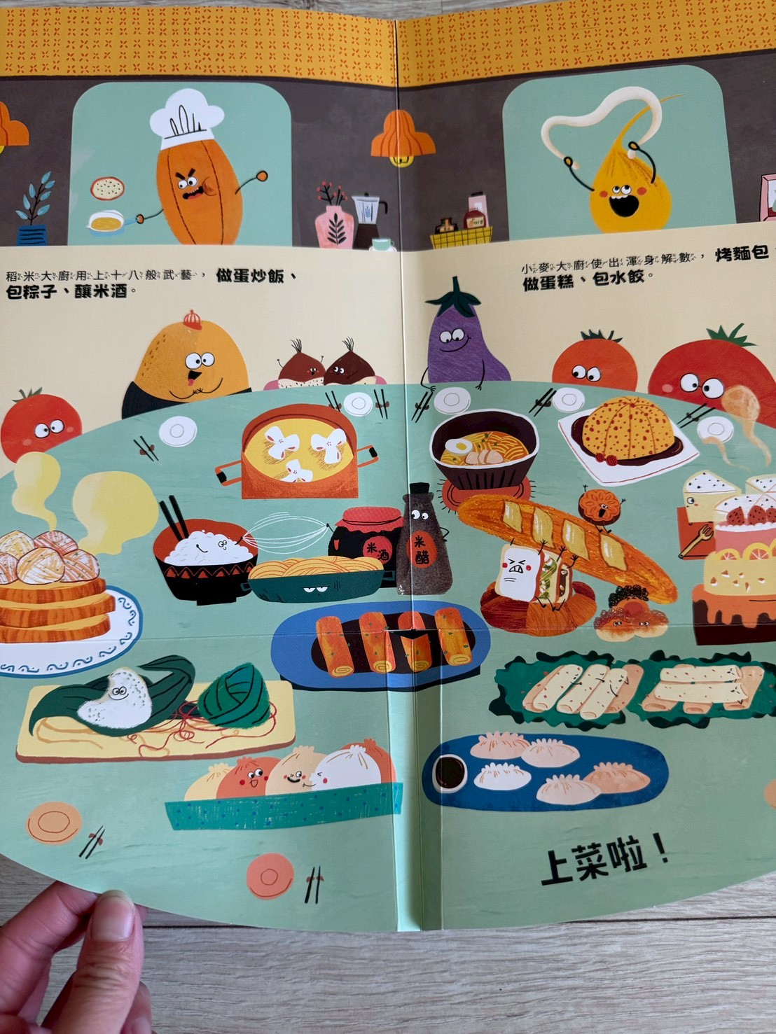 老實說,食物擬人化這點不太蒙特梭利,但食材原型畫得很清楚,從田裡生長、到市場、到餐桌的流程都看得一清二楚。
