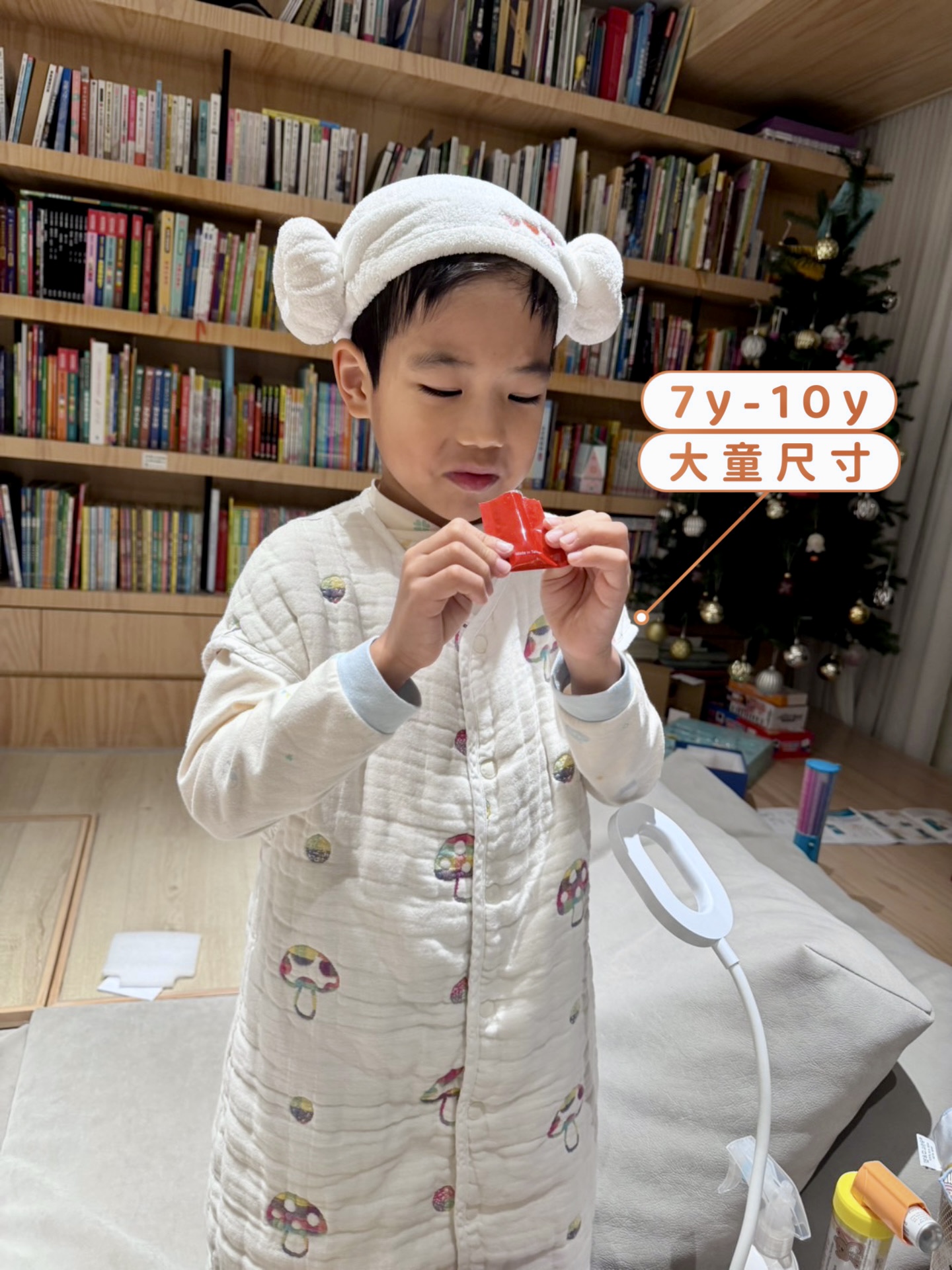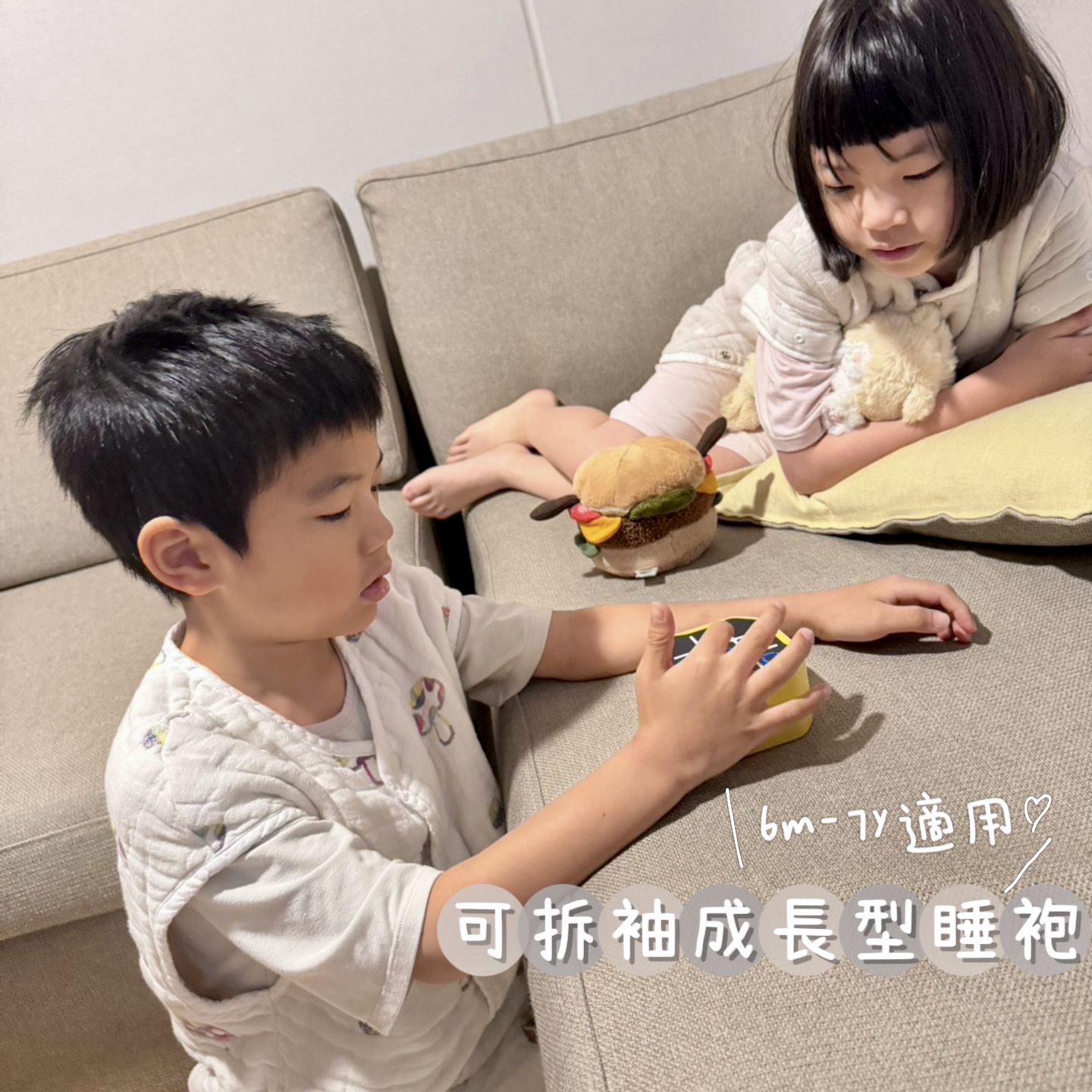好亮小時候穿的是基本背心款,但這次我們也試到 「成長型睡袍」(有袖子的版本)。