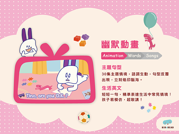 每個動畫中強調一個主題句型,會以單句反覆或是替換語詞的方式重複出現3至4次。