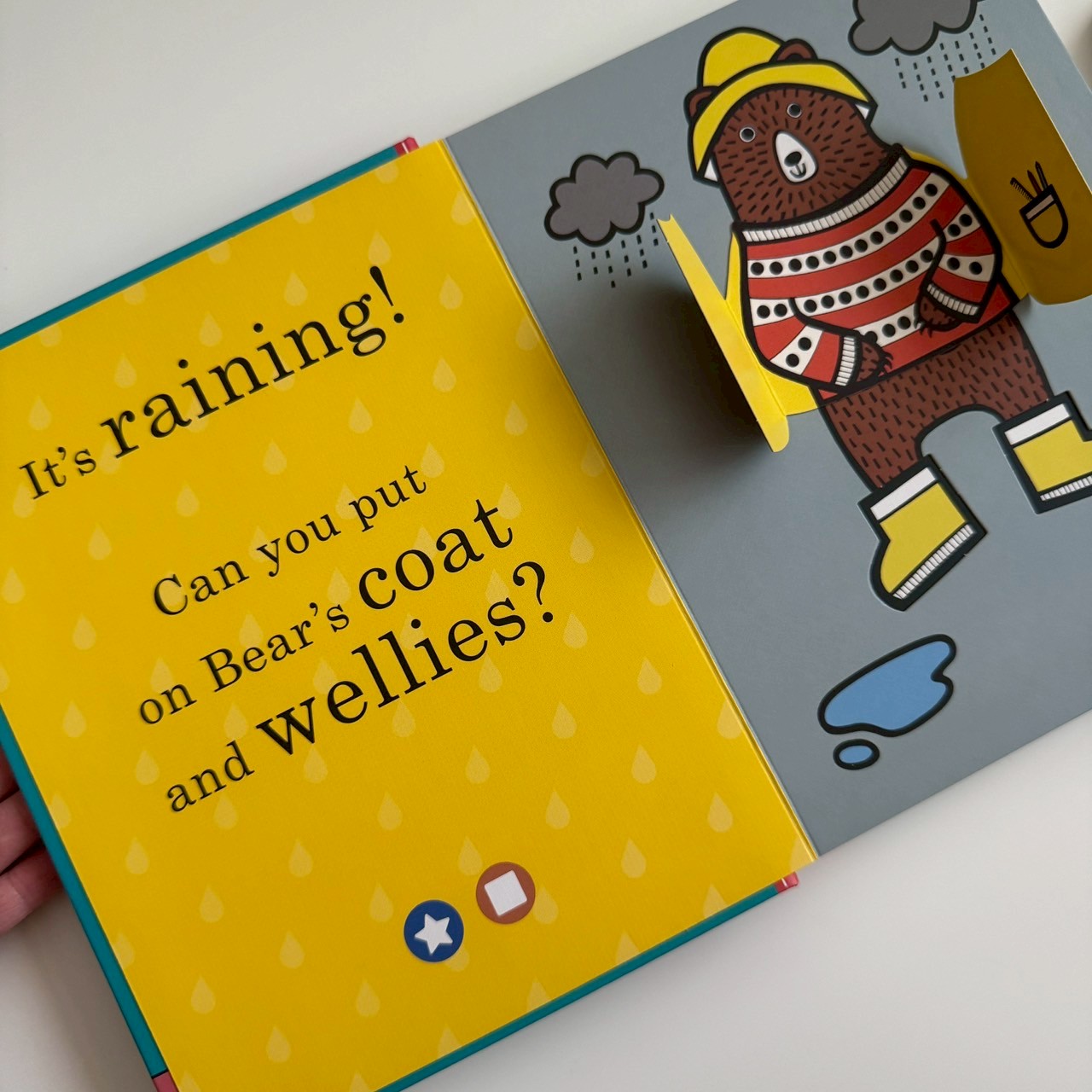 下雨了,熊熊還沒穿雨衣和雨鞋呢!孩子動手幫牠扣上黃色雨衣,再看看腳上有沒有穿對 wellies(雨鞋),操作中就把 coat 和 wellies 這兩個單字牢牢記住。
