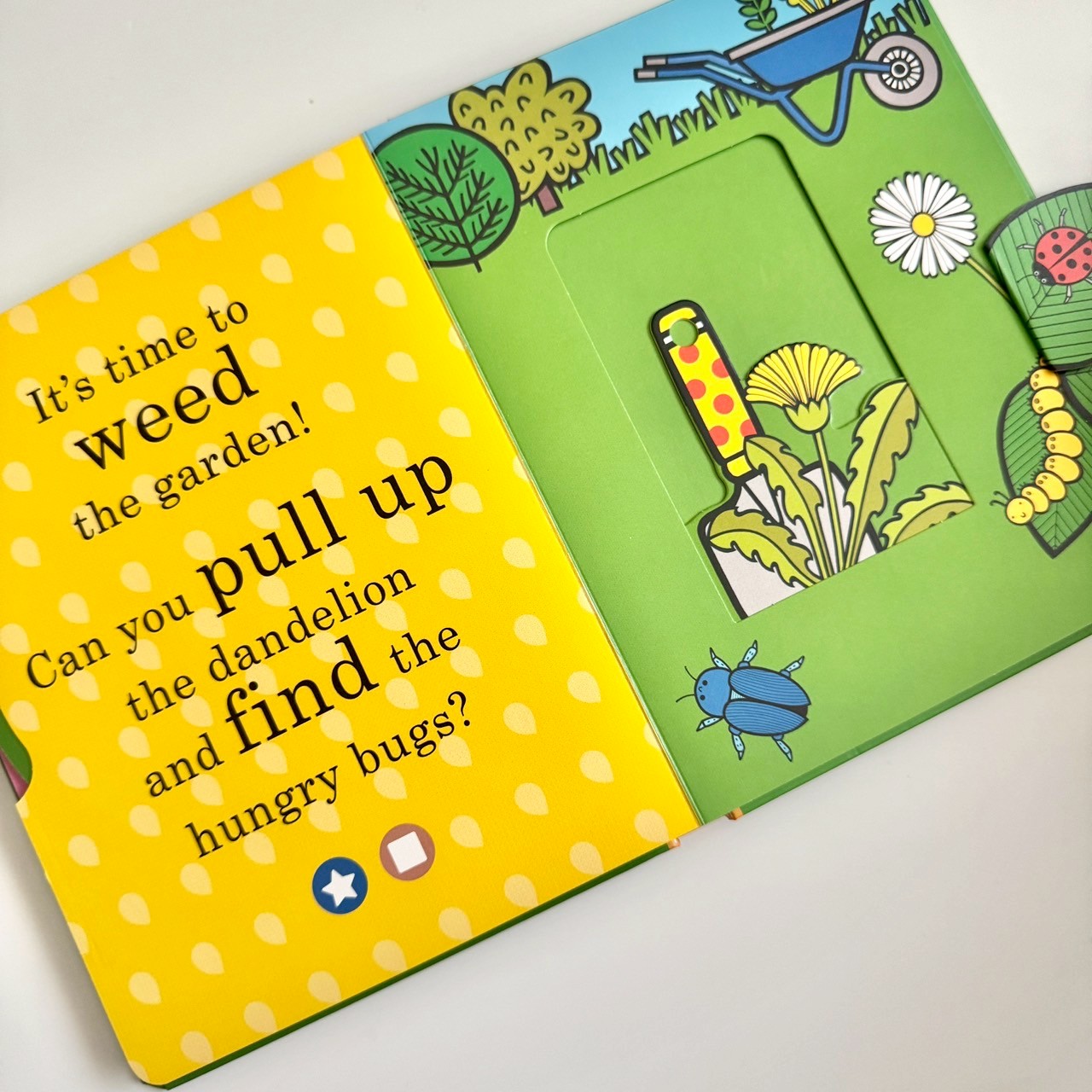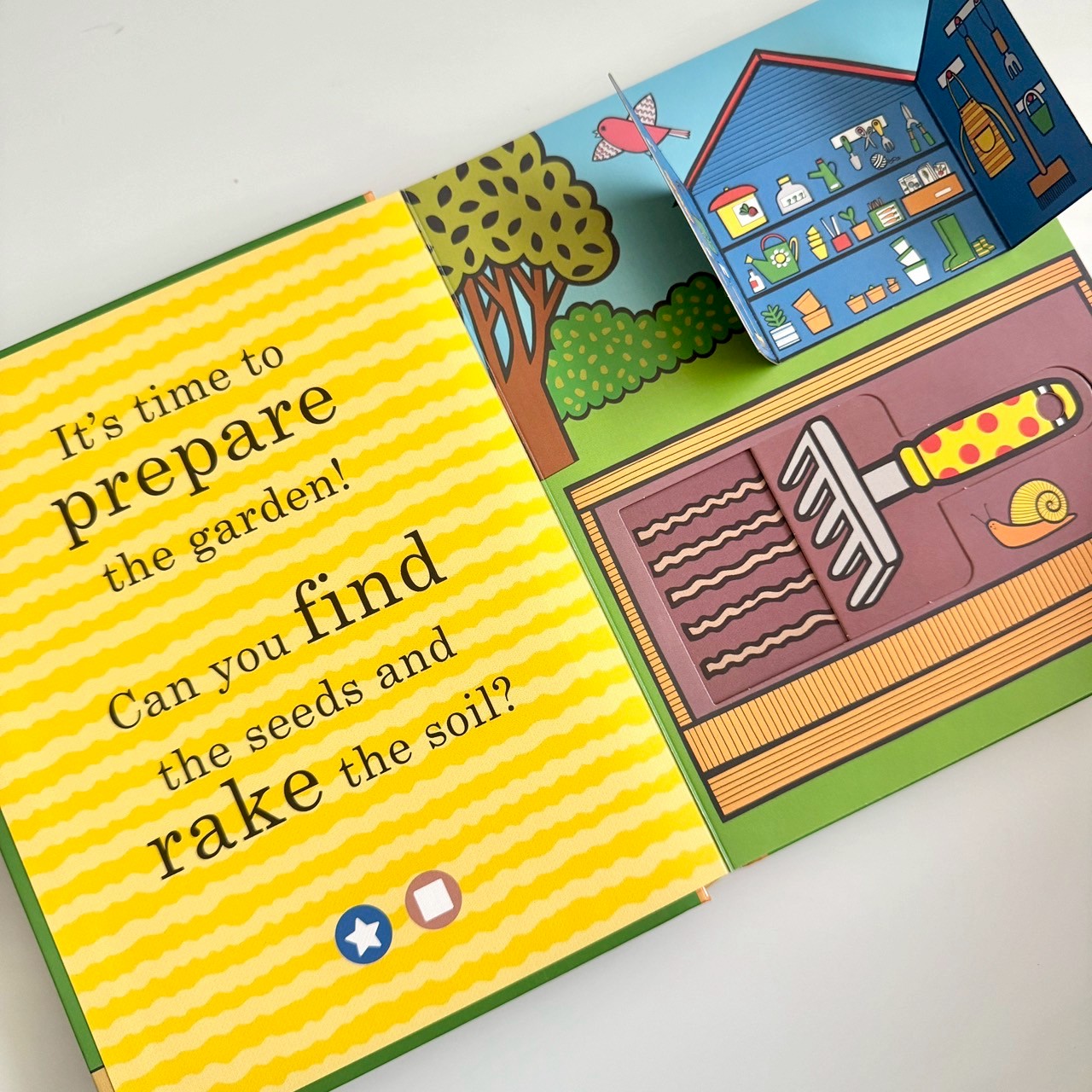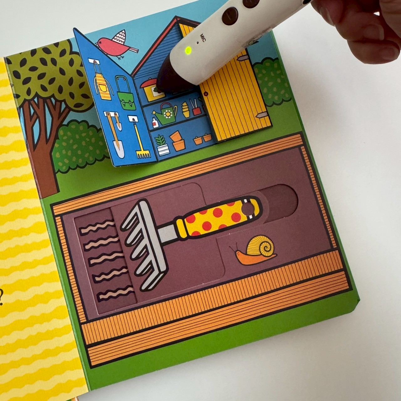 這頁透過 find 和 rake 的動作設計,讓孩子從「找東西、整地」中建立種植前的基本步驟。拉動滑軌,就能耙一耙土壤,鬆鬆土,玩中練習生活動詞的運用。