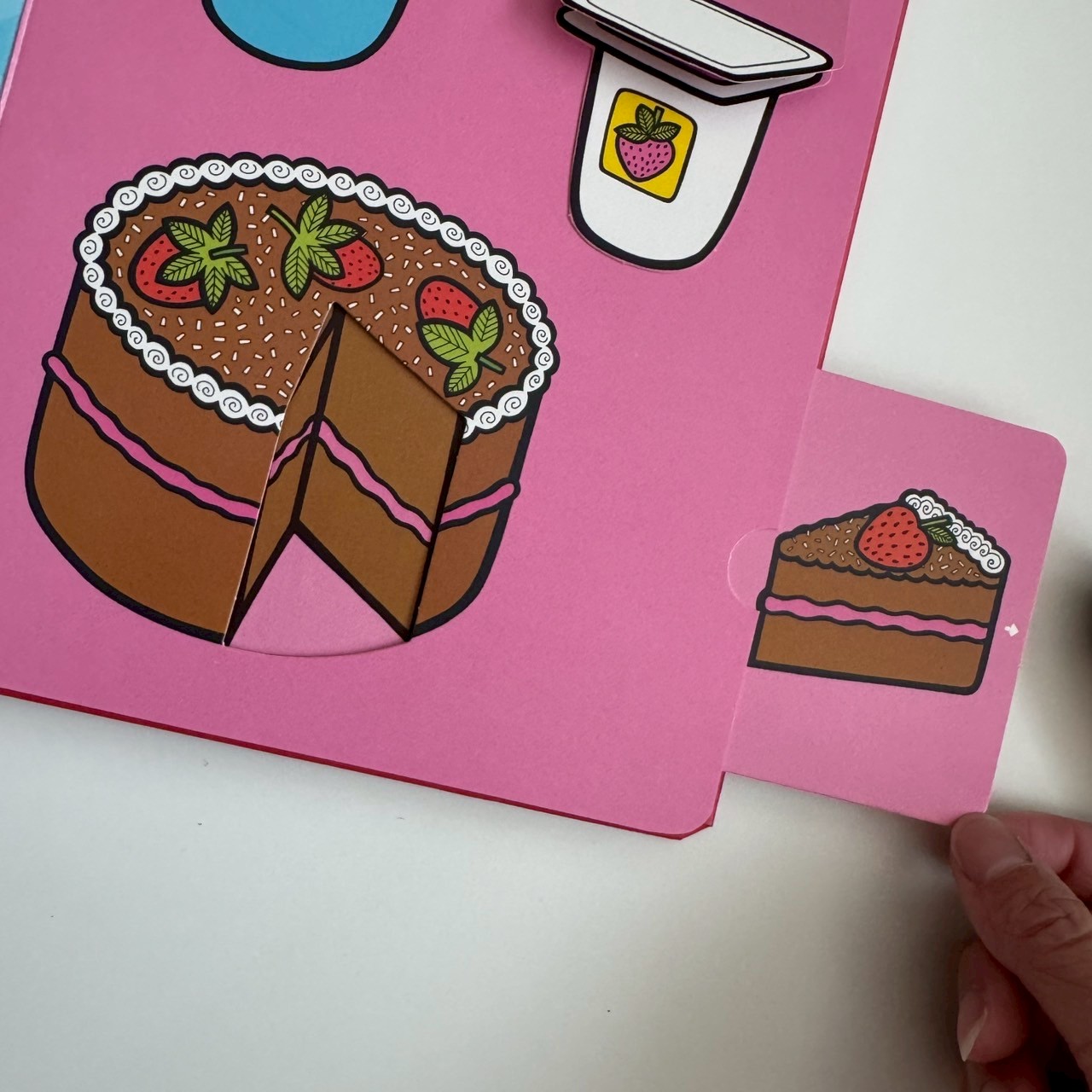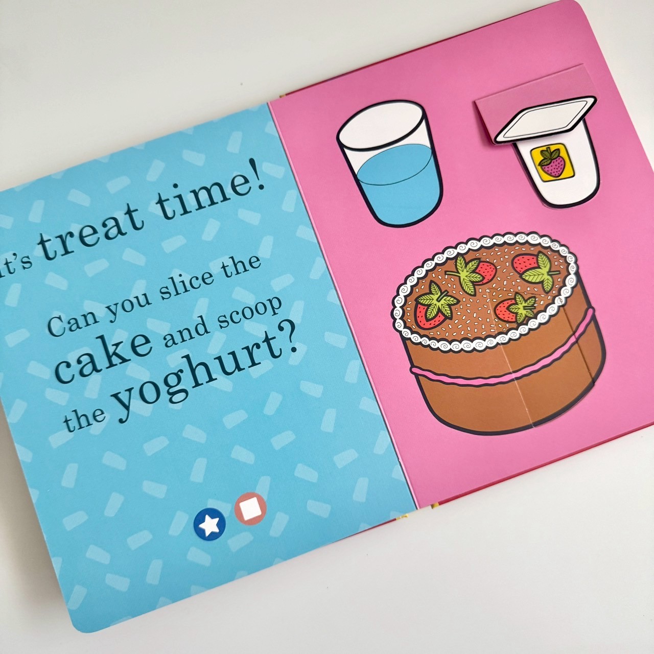 這頁用動作連結了 slice the cake 和 scoop the yoghurt,一邊操作、一邊聽句子,孩子在玩樂中建立「吃甜點」的語言搭配,還能延伸到生活中自己來分食、自己拿湯匙。