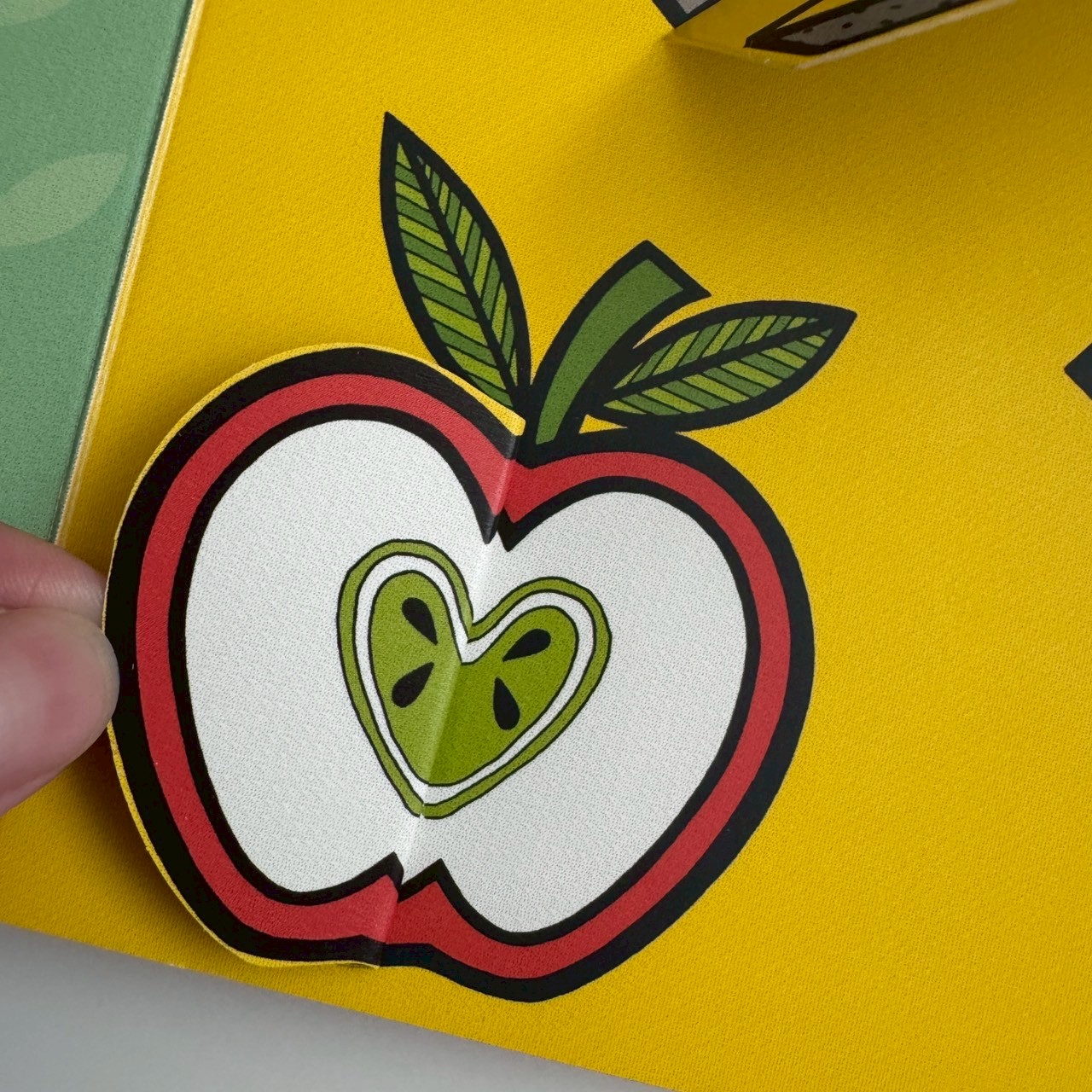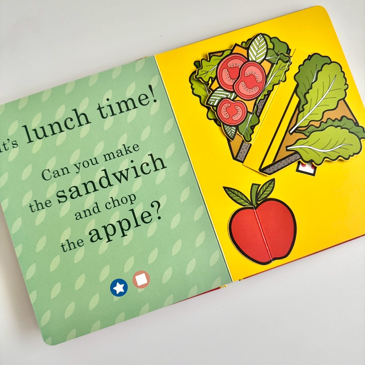 書頁設計讓孩子層層疊出 sandwich,還能對半剖開紅蘋果,觀察蘋果的果核,一口氣學會 make the sandwich 和 chop the apple。動詞搭配動作,甚至一起延伸活用到日常,是不是超好記得。