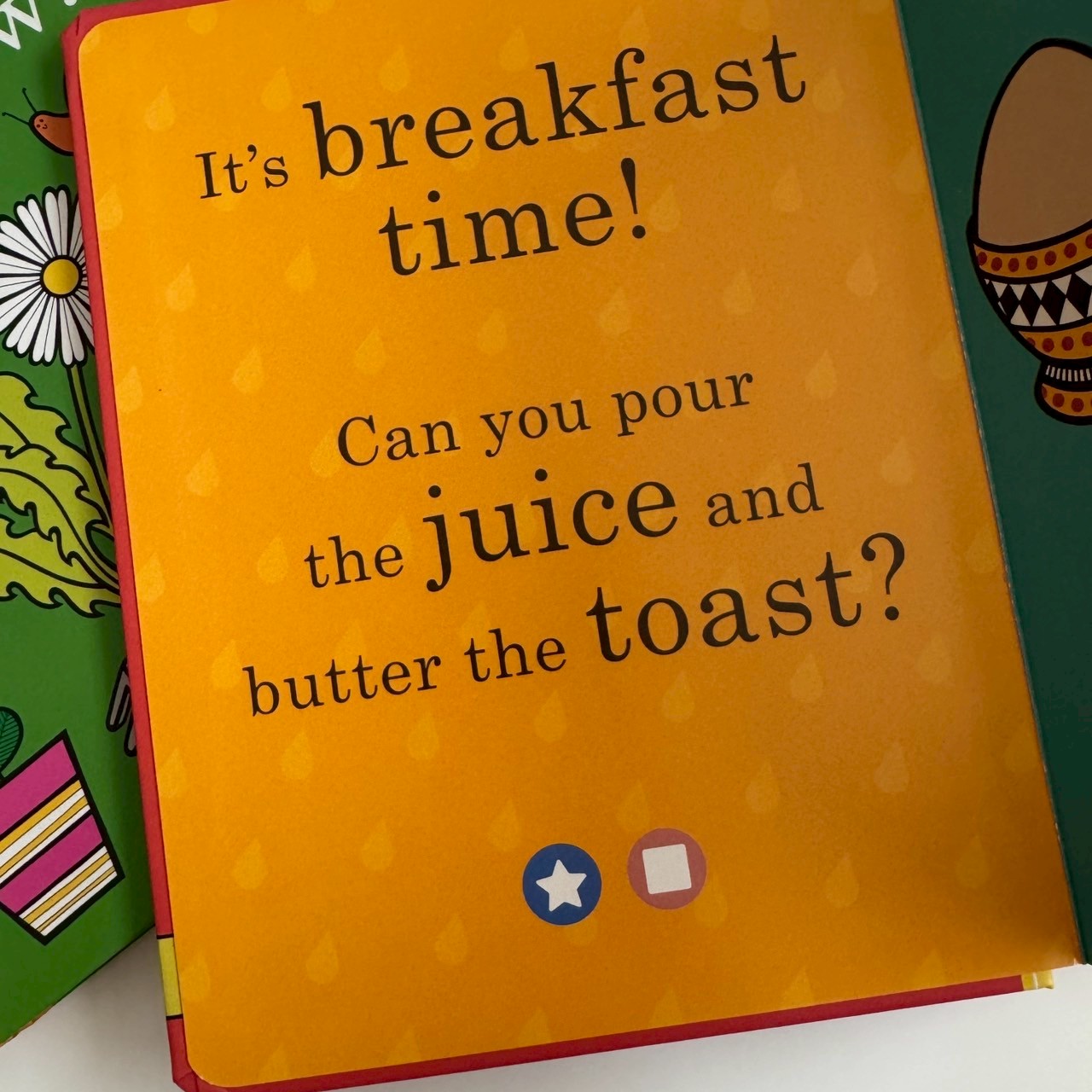 這一頁的 “butter the toast”,讓孩子在動手操作時,自然記住了 butter 作為動詞的用法。比起死記 butter 是奶油,實際動作更能幫助孩子理解「把奶油抹上去」的意思。