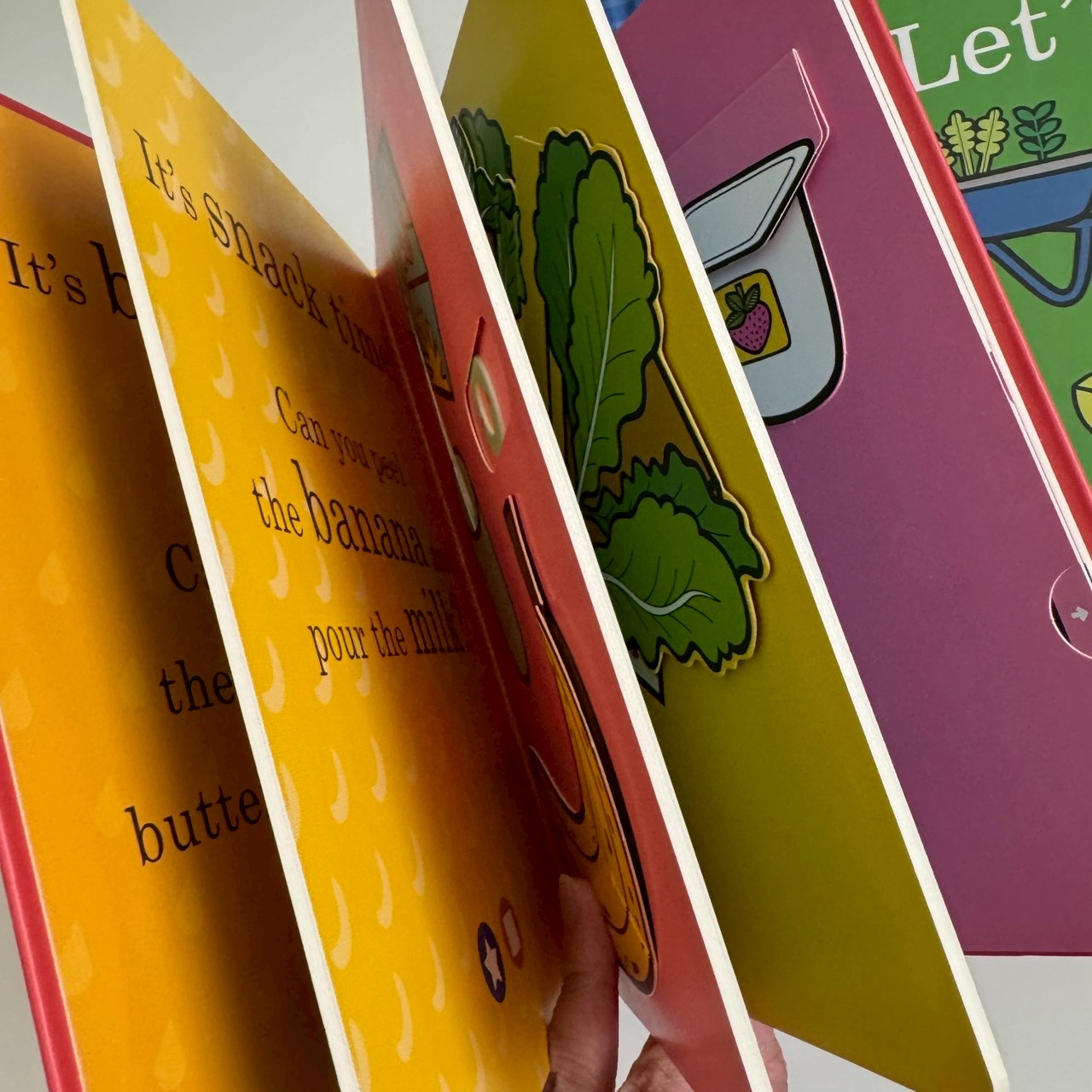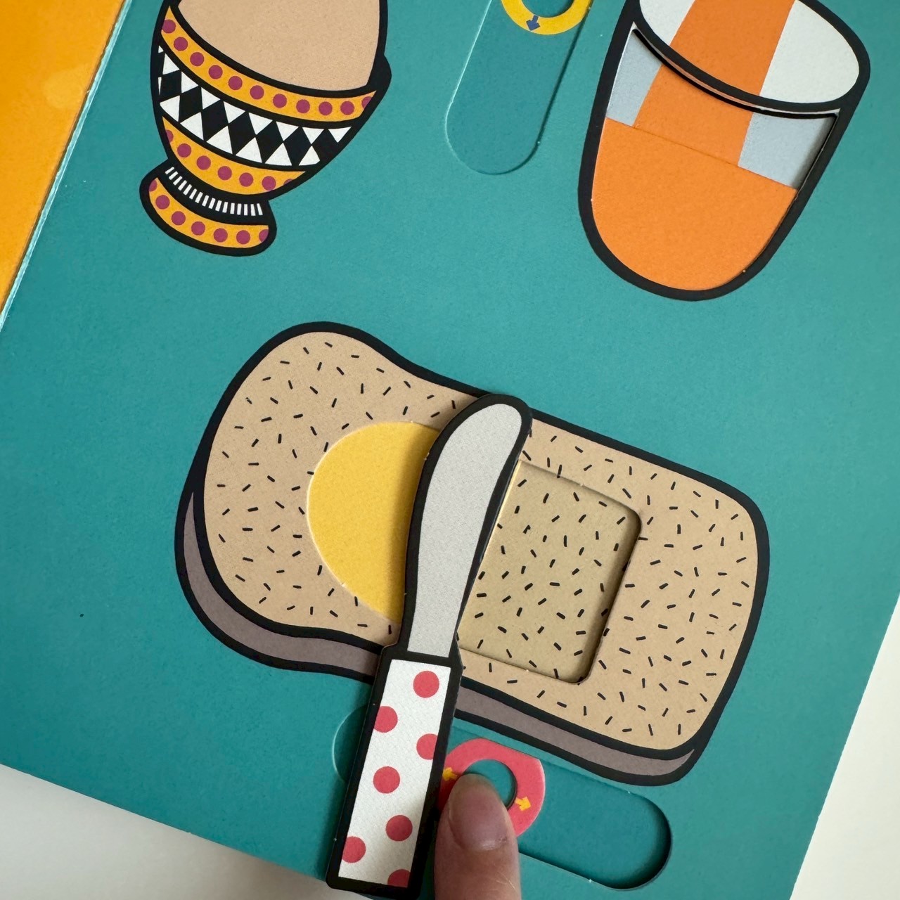 推開書頁中的抹刀,黃色奶油慢慢鋪上吐司,扮家家酒孩子都喜歡,互動機關好像真的在幫自己準備早餐。