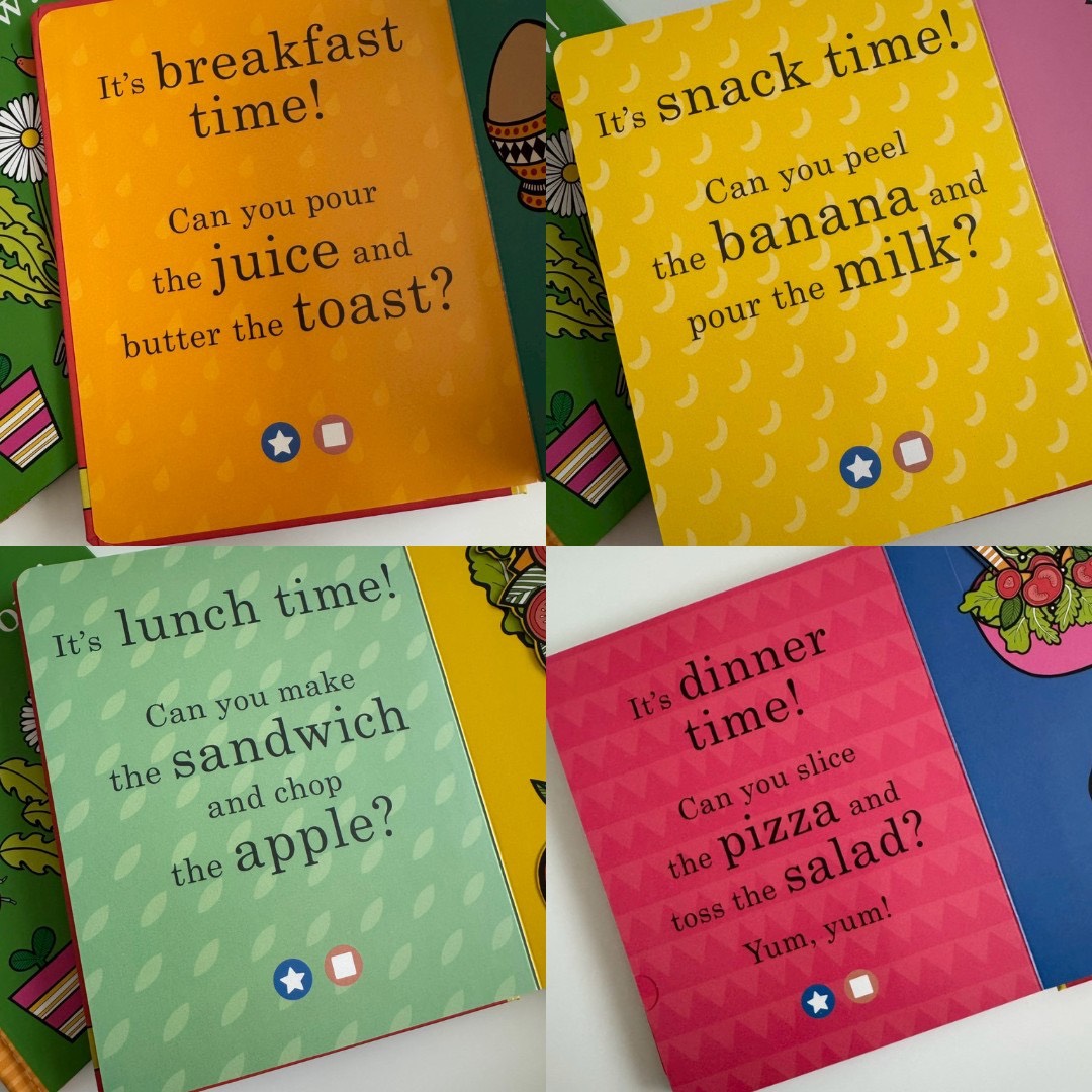 《Let’s Eat!》不只讓孩子玩得開心,也從每天生活日常飲食慢慢滲入,從早餐到點心、午餐、晚餐甚至飯後點心,一頁頁熟悉日常用語,真的很適合剛開始學英文的小小孩。