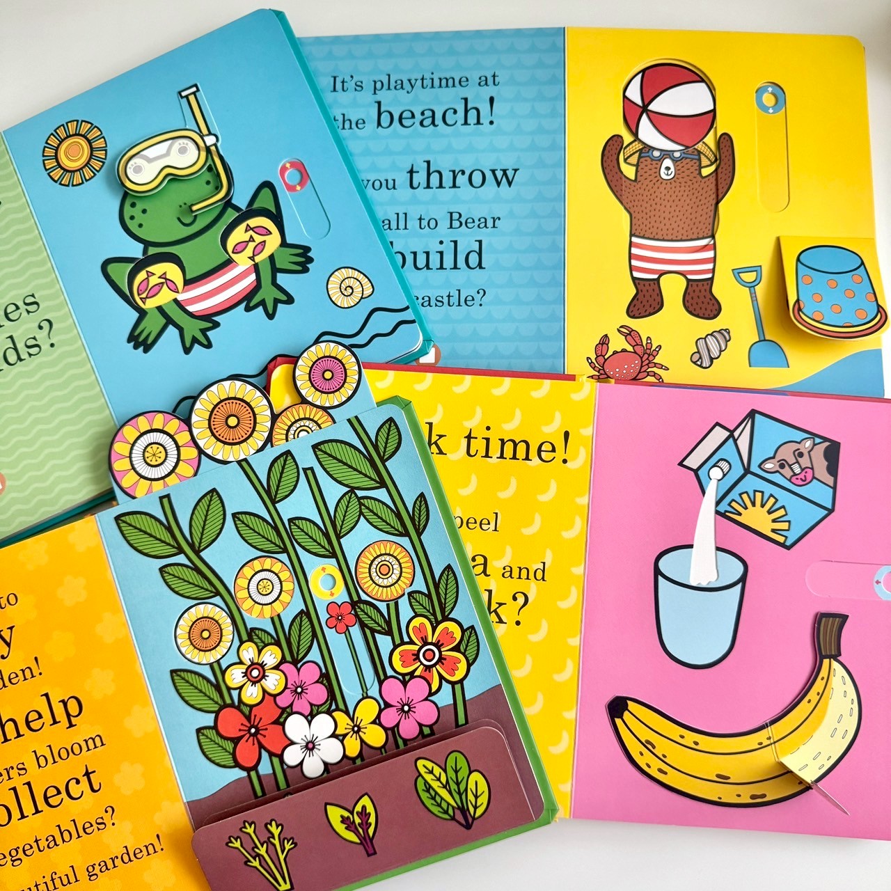 每頁都有推拉、轉盤或翻掀等等互動機關,厚紙頁設計+圓潤圓角,2 歲就能放心操作。