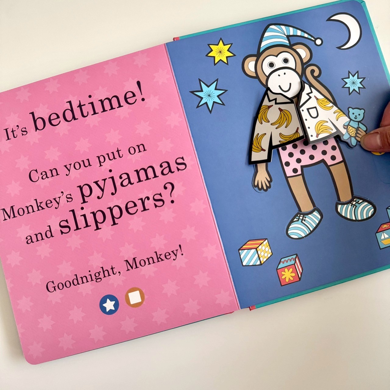 一天結束了,幫猴子穿上 pyjamas 和 slippers,準備說晚安。穿上睡衣,配上 “Goodnight, Monkey!” 這句話,也跟著進入睡前儀式,語言學習就藏在生活的每一個小步驟裡。