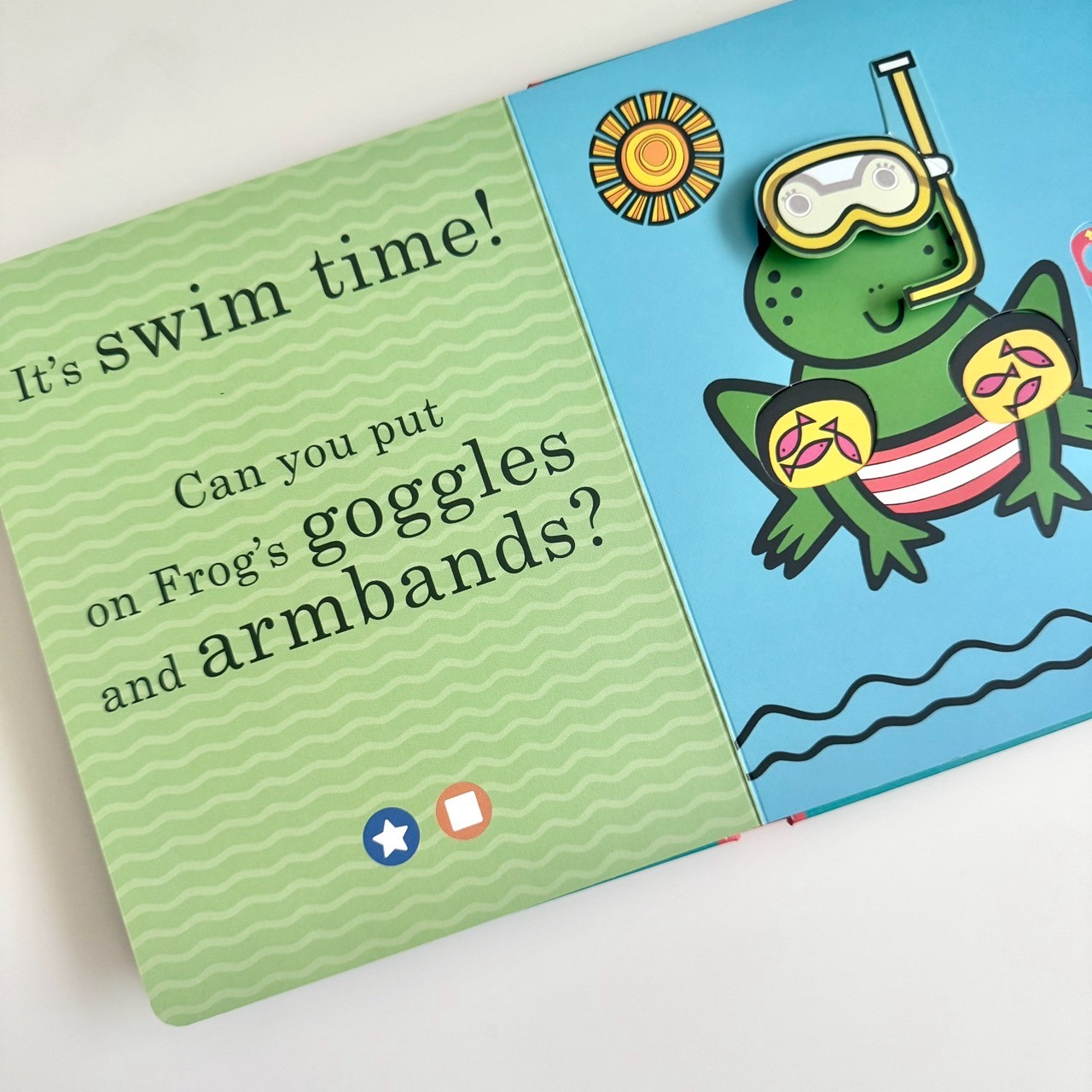 準備下水囉,快幫青蛙戴上 goggles 和 armbands!孩子操作機關,泳鏡和浮力圈就定位,聲音連結與動作一次到位。在遊戲中學到,就特別有記憶點,對孩子來說也更有趣。