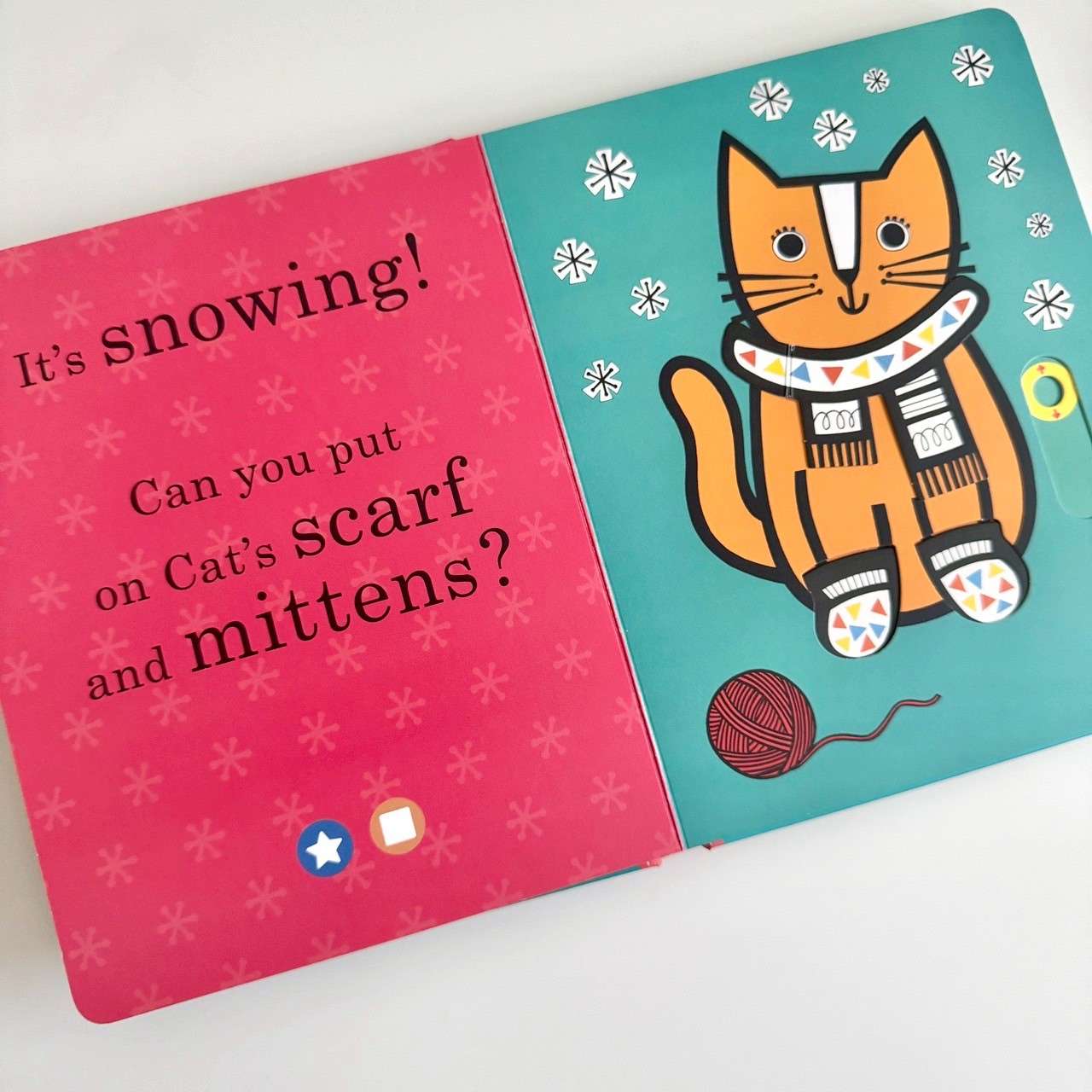 外面下雪了,好冷啊~~貓咪還沒戴上圍巾和手套呢。這頁操作是把 scarf 和 mittens 幫貓咪穿上,一邊動手,一邊聽句子 “Can you put on Cat’s scarf and mittens?”