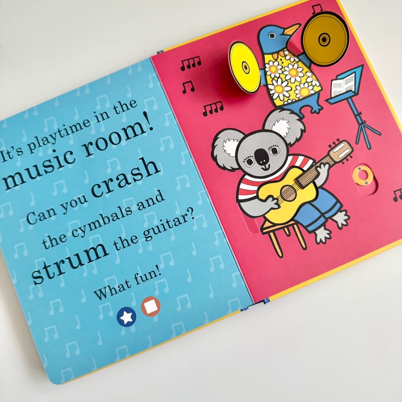 在音樂教室,大嘴鳥敲鈸(crash the cymbals)、無尾熊彈吉他(strum the guitar),孩子邊動手、邊聽,幫助孩子把抽象的動詞轉化成具體感受。