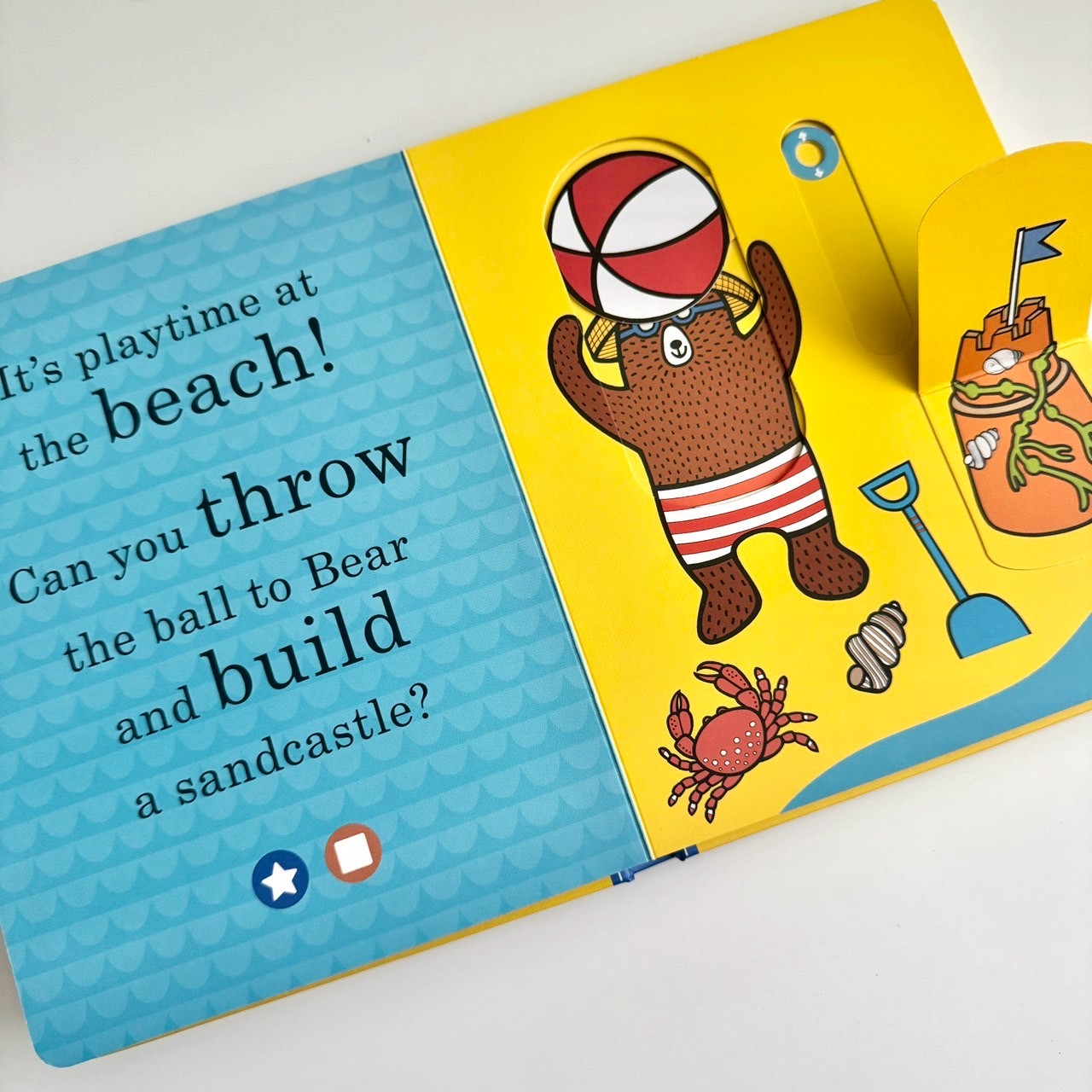 這一頁讓孩子動手 “throw the ball” 丟球、掀開沙堡蓋子來“build a sandcastle”。搭配單字 throw、build,實際操作動作,加上點讀聲音輸入,孩子不只是記單字,而是記得那個「玩」的當下。
