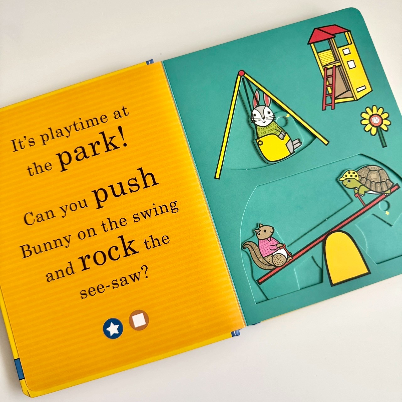 孩子可以推兔子 “push Bunny on the swing”,也可以來回晃動鞦韆或翹翹板,搭配句子裡的動詞 push 和 rock,一邊動手、一邊聽就自然記住了。