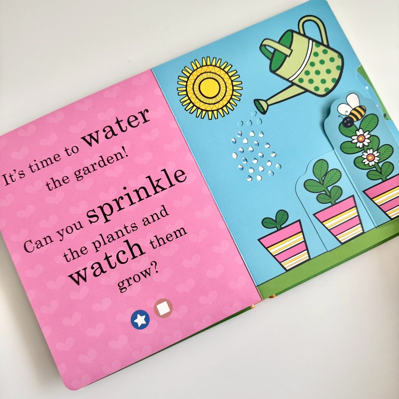 這頁的 sprinkle 和 watch 結合澆水與觀察的動作,讓孩子動手操作澆水器,感受植物成長的節奏。